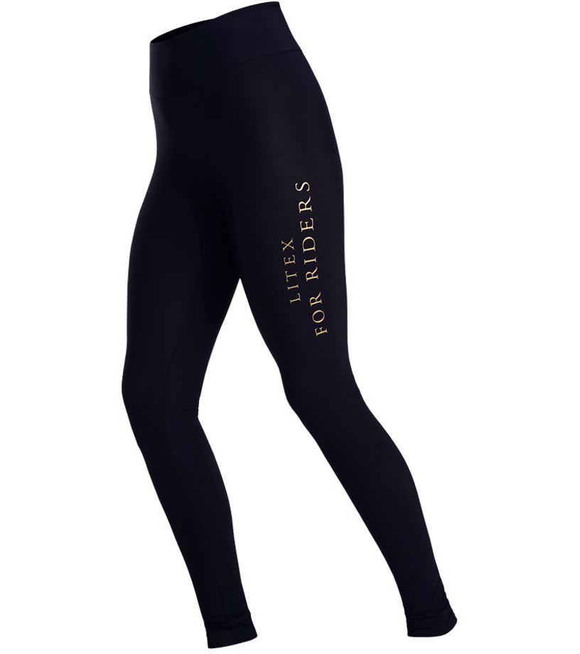 Damskie długie legginsy z szeroką elastyczną talią. Złoty nadruk na zewnętrznej stronie nogawek. Materiał dopasowuje się do każdego Twojego ruchu, jest elastyczny i zachowuje swój kształt przy każdym ruchu.