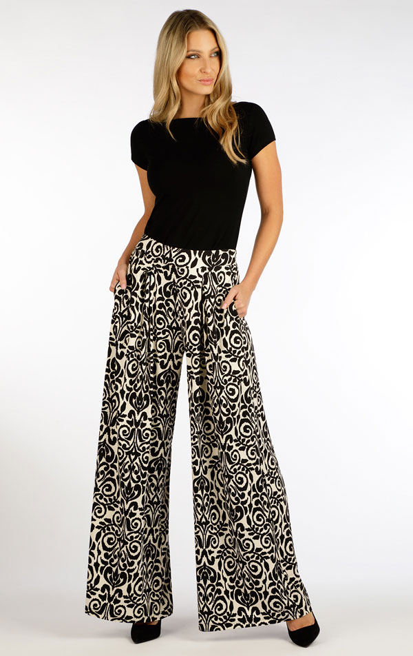 Spodnie damskie z szerokimi nogawkami. Elastyczny pas z wygodną gumką zapewnia komfortowe dopasowanie. Praktyczne kieszenie boczne. Spodnie z szerokimi nogawkami imitują spódnicę. Lekki, tkany materiał z dużą zawartością wiskozy i obecnością elastanu gwarantuje wyjątkowo przyjemne uczucie podczas noszenia, jest oddychający i nie gniecie się.