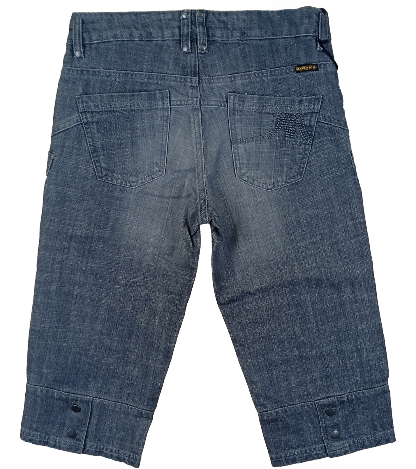 Damskie spodnie jeansowe 3/4 w ciemnoniebieskim odcieniu z lekko strukturalnym denimem. Wygodny krój z wyższym stanem zapewnia wygodę i dobre dopasowanie. Spodnie zapinane są na guzik i zamek błyskawiczny, mają widoczne kieszenie z przodu z ozdobnymi przeszyciami oraz wzmocnione szwy dla większej trwałości. Skrócony krój za kolana idealnie sprawdzi się w cieplejsze dni i w swobodnym, miejskim stylu. Doskonały wybór na co dzień i w czasie wolnym.