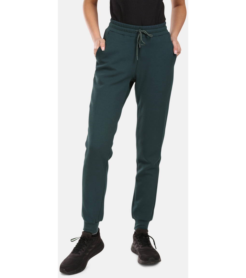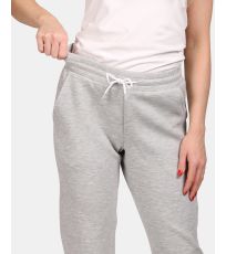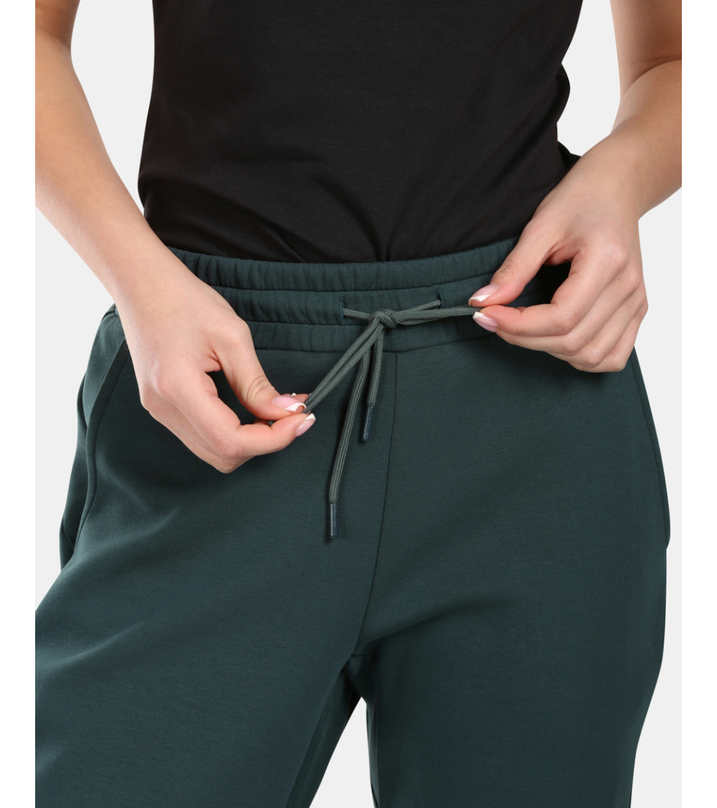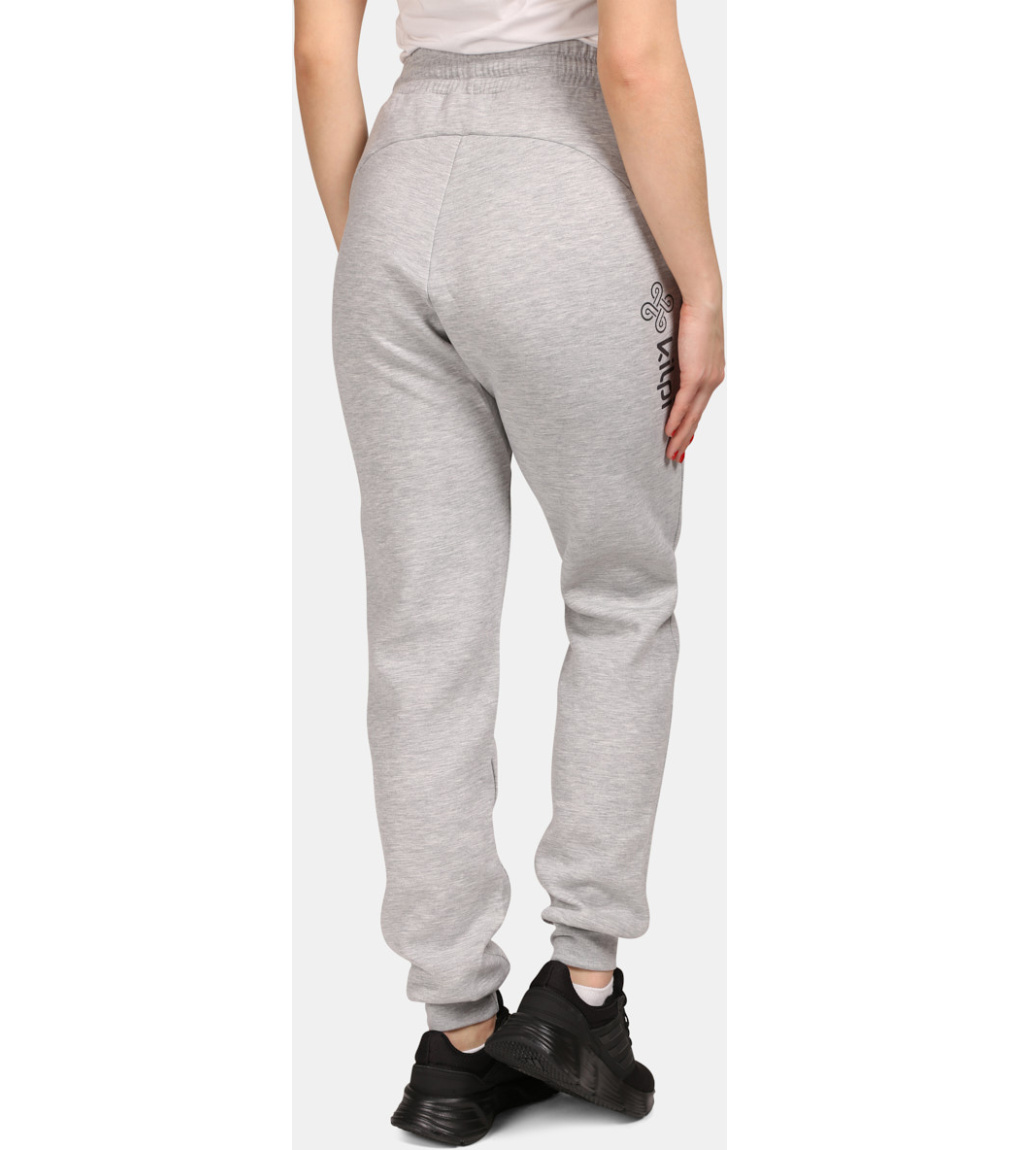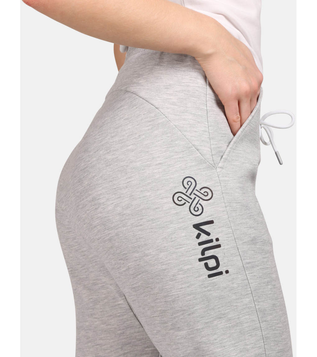 Kilpi MATTY-W to wygodne damskie spodnie dresowe rekreacyjne, wykonane z bawełnianej dzianiny, która działa lekko chłodząco. Dresy mają szeroką elastyczną talię ze sznurkiem i dwiema kieszeniami, elastyczne zwężane nogawki i tęczowe odblaskowe logo.