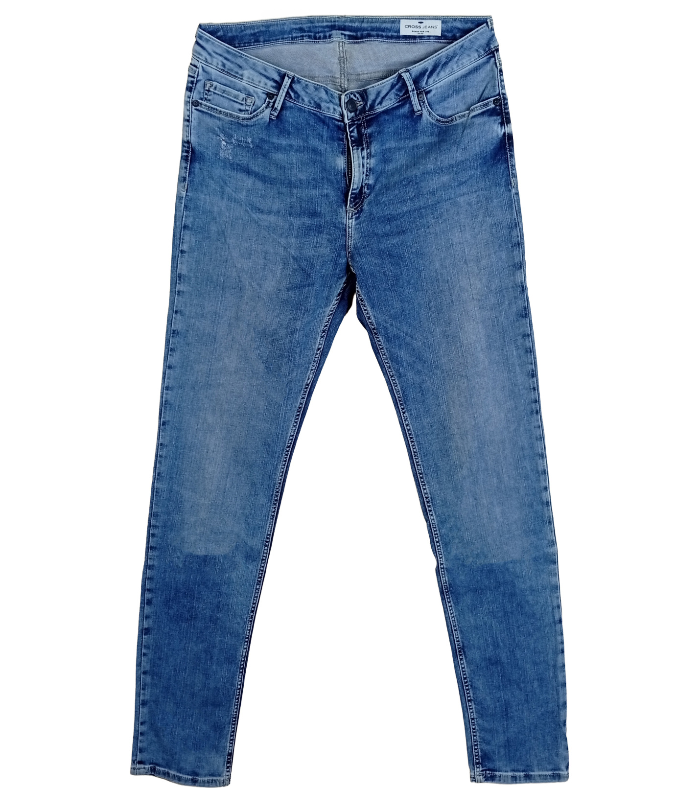 Szare jeansy zapinane na zamek błyskawiczny. Jeansy mają węższy krój, wyższy stan i węższe nogawki. Markowe jeansy mają dwie klasyczne kieszenie z przodu i dwie z tyłu oraz jedną mniejszą, która jest częścią prawej kieszeni przedniej. Z tyłu spodni naszyta jest skórzana metka z nazwą marki. Spodnie są lekko rozjaśnione w okolicy boków.