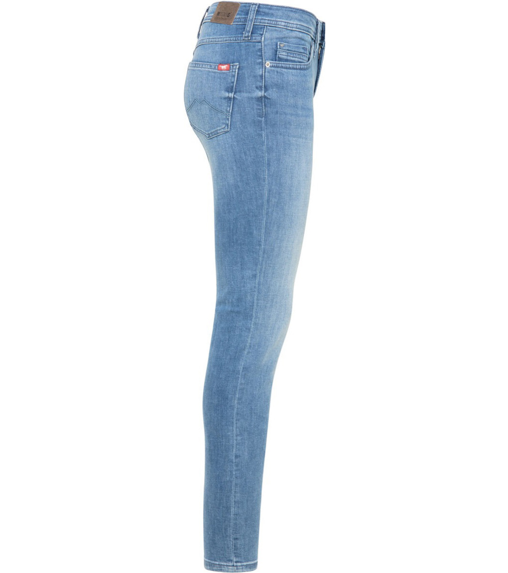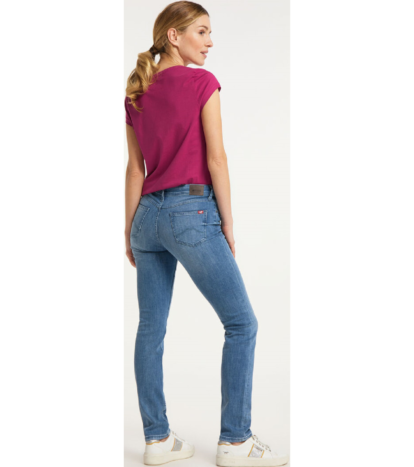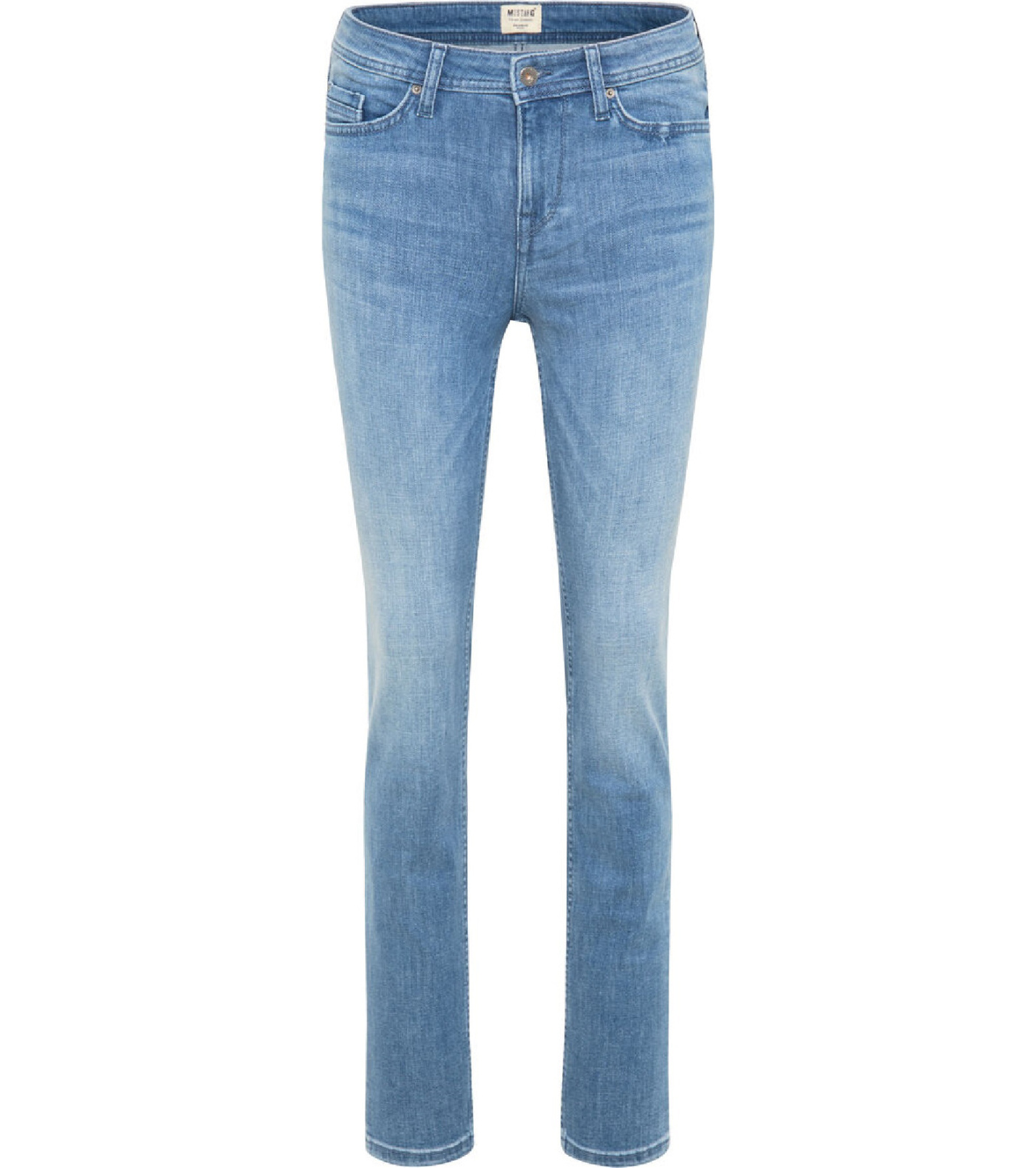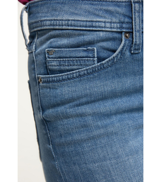 Jeansy mają dopasowany krój, wysoki stan i zwężane nogawki. Markowe spodnie mają dwie klasyczne kieszenie z przodu i dwie z tyłu, a także jedną mniejszą kieszeń, która jest częścią prawej przedniej kieszeni i jest ozdobiona małym metalowym logo Mustang. Z tyłu spodni naszyta jest skórzana metka z nazwą marki.
