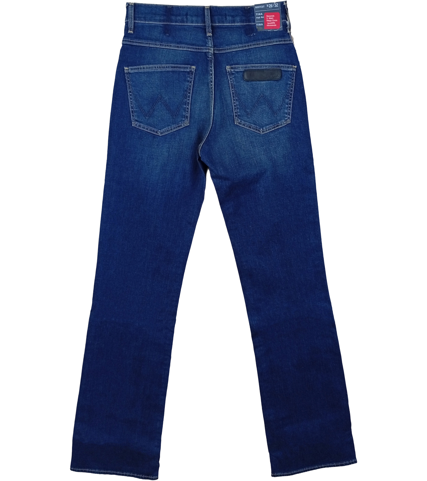 Ciemnoniebieski denim z subtelnymi przeszyciami z przodu nadaje jeansom nowoczesny wygląd. Tylne kieszenie z charakterystycznym przeszyciem w kształcie litery „W” i skórzane logo Wrangler świadczą o ich oryginalności i jakości.