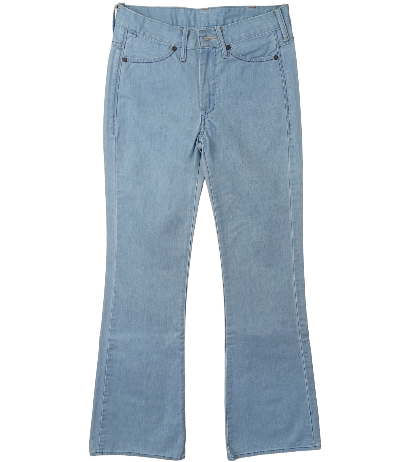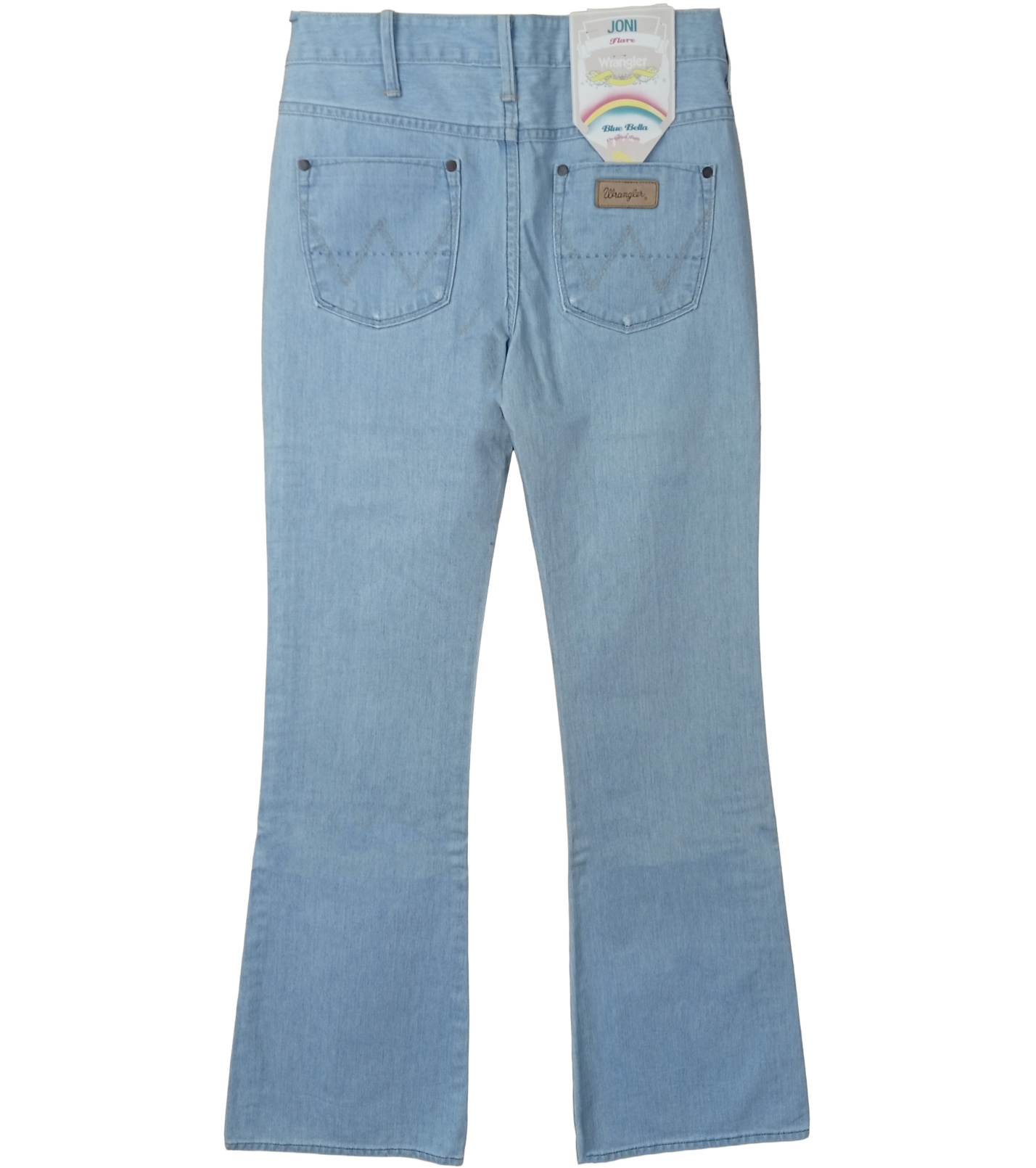 Spodnie zapinane są na klasyczny zamek błyskawiczny i metalowy guzik, mają szlufki na pasek oraz dwie kieszenie z przodu z małą kieszonką. Tył zdobią dwie kieszenie z charakterystycznym przeszyciem w kształcie litery „W”, charakterystycznym dla marki Wrangler. Nad prawą kieszenią znajduje się skórzana metka z logo marki oraz papierowa metka z oznaczeniem serii Joni Flare Leg.