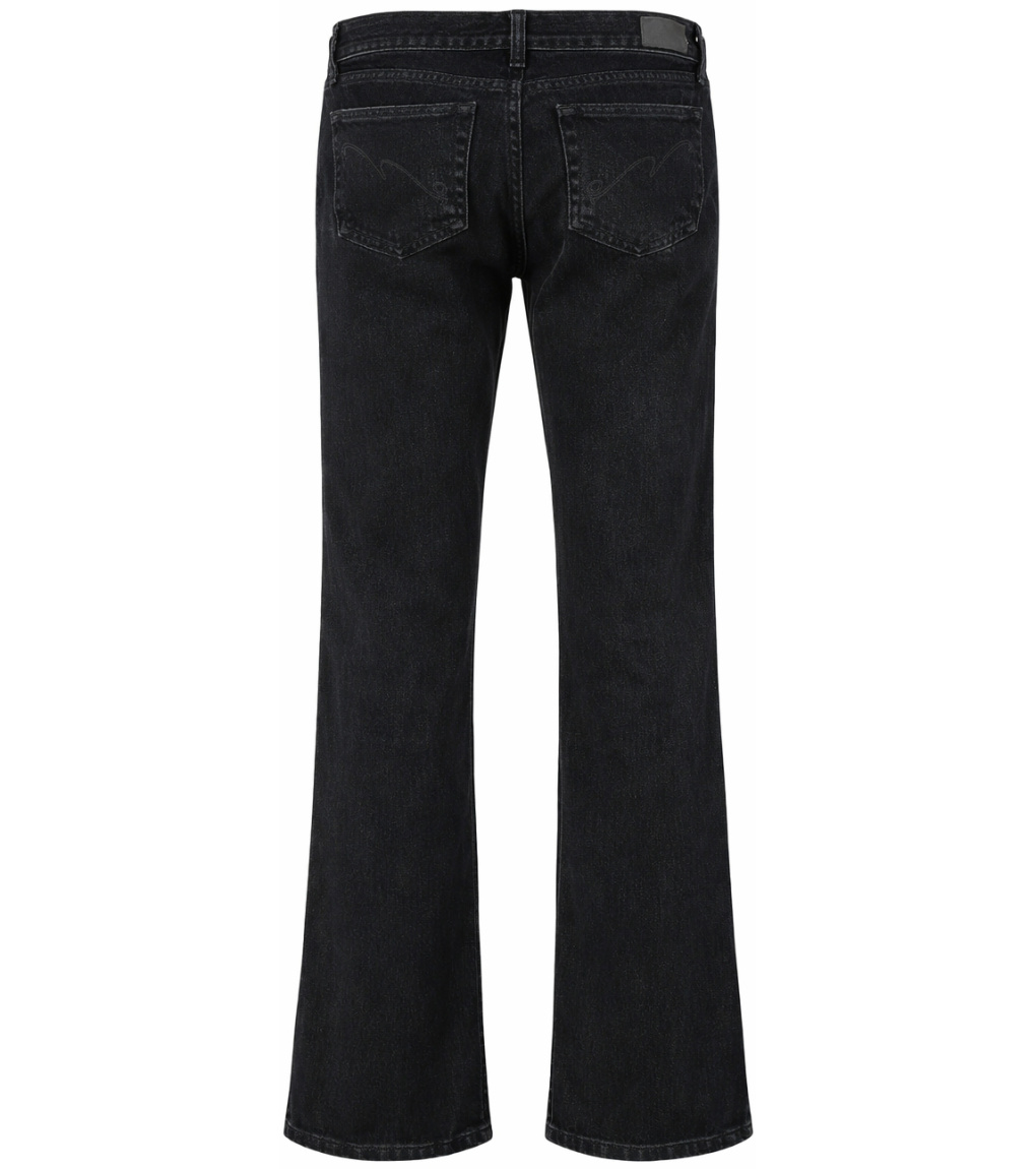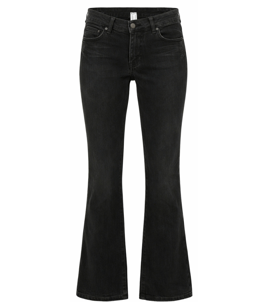 Czarne jeansy z delikatnym efektem przetarcia i rozszerzanymi nogawkami u dołu, tworzące nowoczesną sylwetkę w kształcie dzwonu. Dopasowany krój w biodrach i udach podkreśla sylwetkę, a wysokiej jakości denim zapewnia komfort noszenia. Klasyczne zapięcie na guzik i zamek błyskawiczny, pięć kieszeni i przeszycia w tonacji ton nadają modelowi ponadczasowy wygląd. Doskonały wybór do stylowych stylizacji na co dzień i na wieczór.