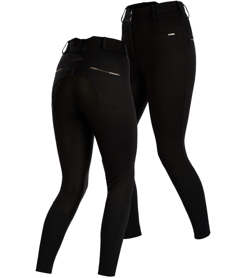 Damskie legginsy wyścigowe z silikonowymi gripami na całym tyle. Praktyczne kieszenie na przodzie. Wysoko wyprofilowana talia wyposażona jest w szerokie szlufki na pasek, a z tyłu znajdują się kieszenie ozdobione kryształkami. Wysokiej jakości elastyczny materiał gwarantuje wysoki komfort i wygodę przez cały okres noszenia.
