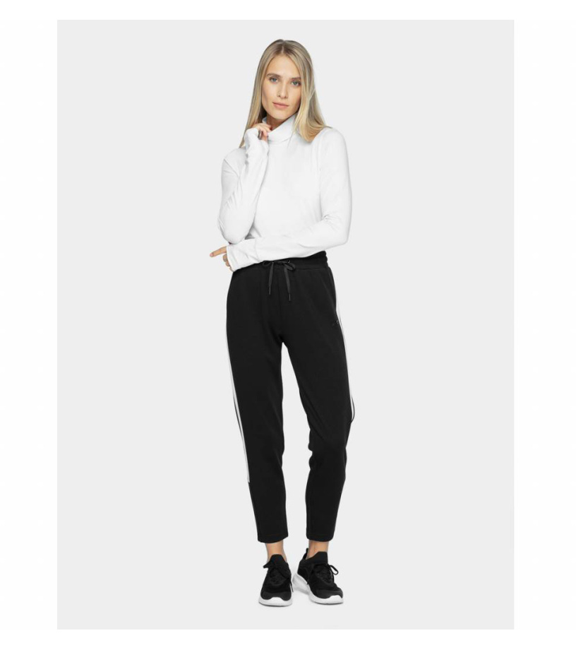 Damskie spodnie dresowe z prostymi nopgawkami wykonane z wygodnej dzianiny, która zapewni maksymalny komfort przez cały dzień. Wykończenie antypillingowe chroni przed powstawaniem grudek na materiale. Proste nogawki bez sznurków z kontrastowymi paskami po bokach. Szeroka elastyczna talia z zewnętrzną regulacją do indywidualnej regulacji. Boczne kieszenie otwarte.