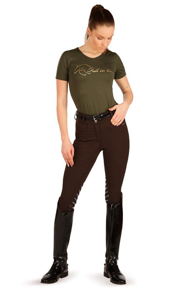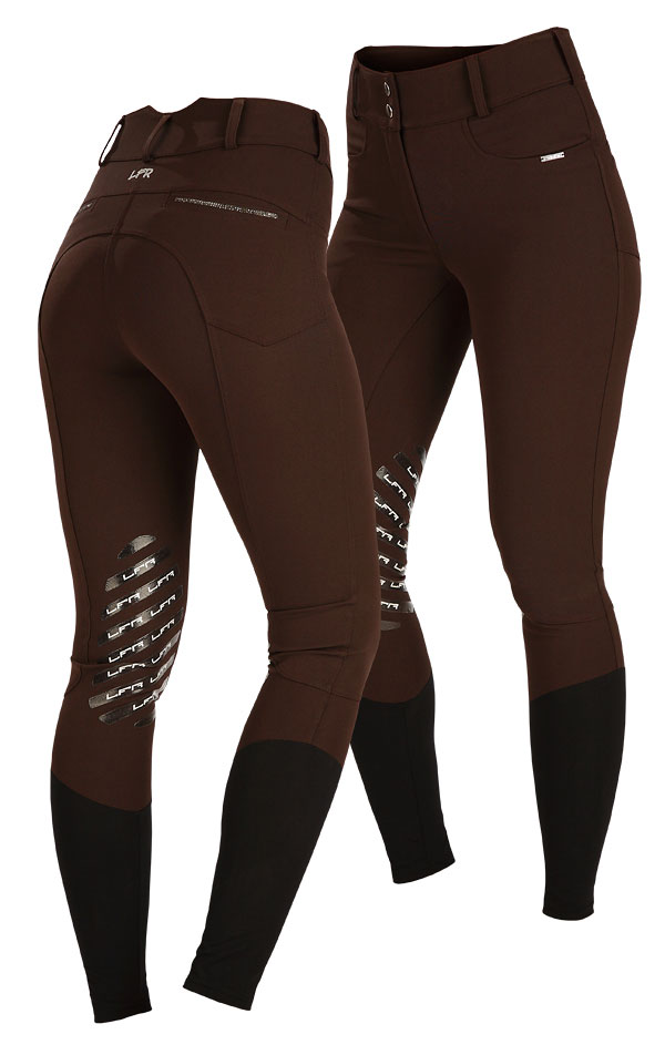 Spodnie jeździeckie damskie. Tylne kieszenie wykończone kryształkami. Dolna część nogawek wykończona elastyczną dzianiną. Gripy w okolicy kolan. Logo 3D LFR. Brązowy + czarny.