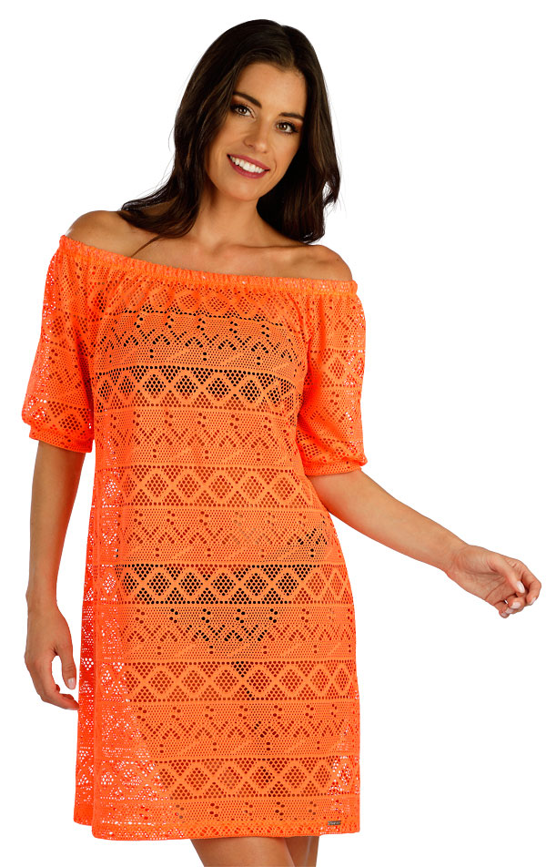 Damska sukienka plażowa. Można nosić z dekoltem w łódkę lub z odkrytymi ramionami. Rękaw w mankiet. Luźny krój. Długość sukienki to ok. 85 cm.