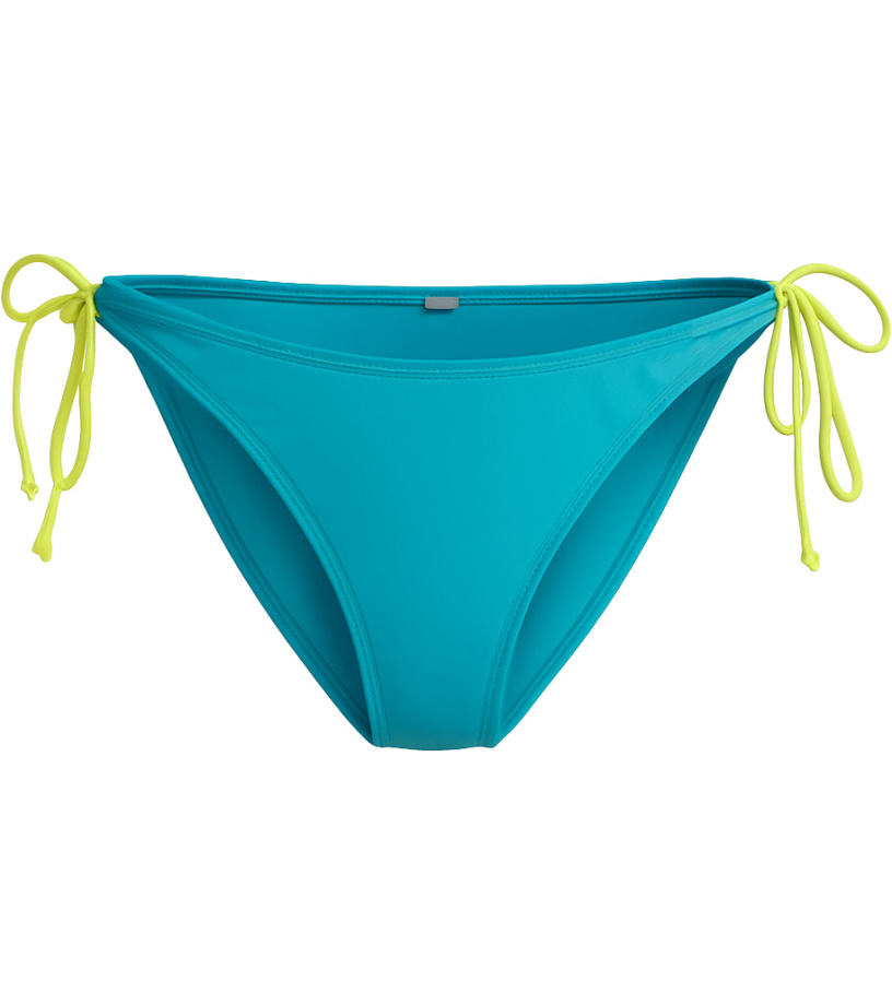 Damskie majtki kąpielowe 4F w jaskrawym turkusie z kontrastującymi żółtymi sznurkami po bokach prezentują się świeżo i letnio. Wykonane są z szybkoschnącego, elastycznego materiału, który dopasowuje się do sylwetki i zapewnia komfort podczas pływania i opalania.