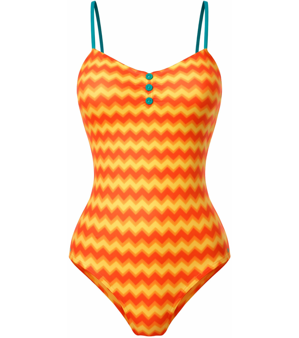Jednoczęściowy kostium kąpielowy dla kobiet z ciekawym wycięciem.