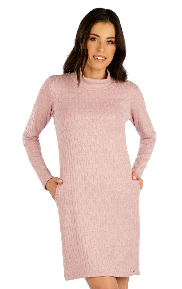 Damska sukienka z dzianiny. Dopasowany krój. Stójka. Praktyczne kieszenie boczne. Dzianina o splocie warkoczowym z domieszką wiskozy i elastanu jest bardzo przyjemna dla ciała, bardzo elastyczna i nie gniecie się. Długość sukienki to ok. 90 cm.