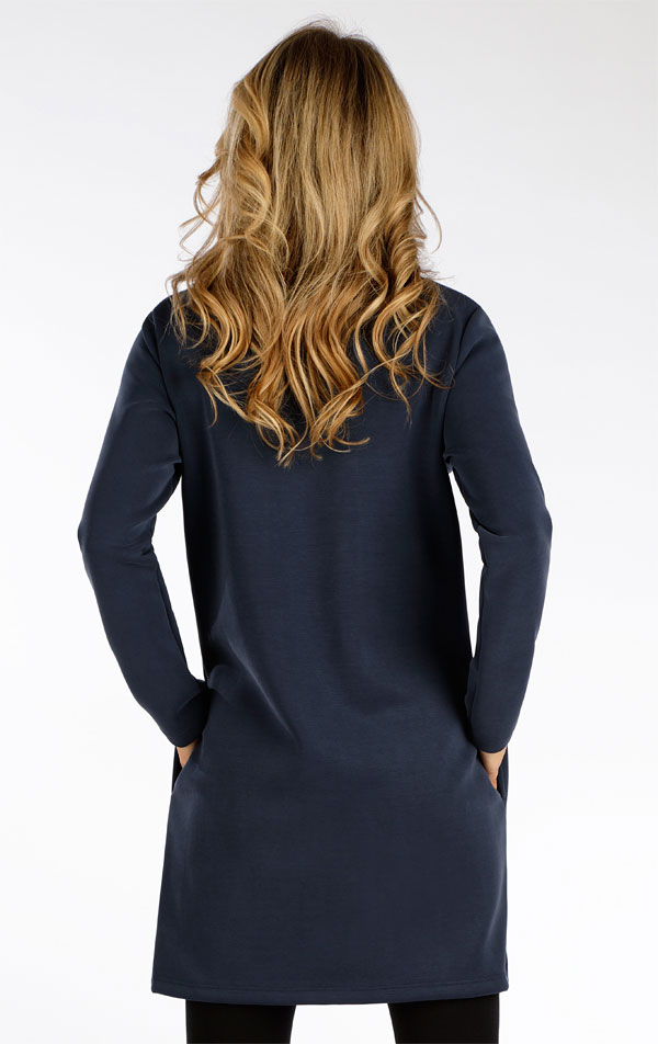 Prosty krój z wysoką, obniżoną stójką i praktycznymi kieszeniami bocznymi. Luksusowy, elastyczny materiał z przyjemnym meszkiem od wewnątrz. Gładki, jedwabisty w dotyku i ciepły materiał zapewniają pełen komfort noszenia. Długość sukienki ok. 85 cm.