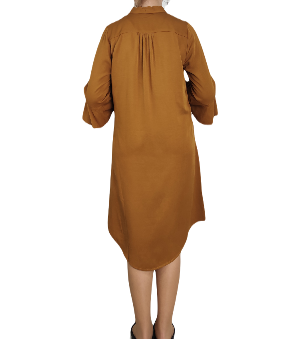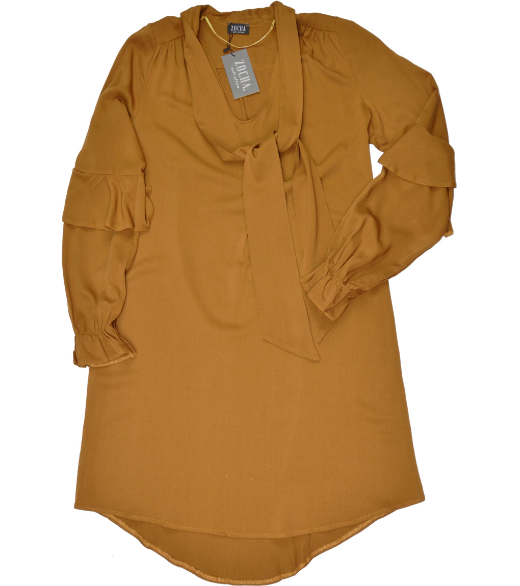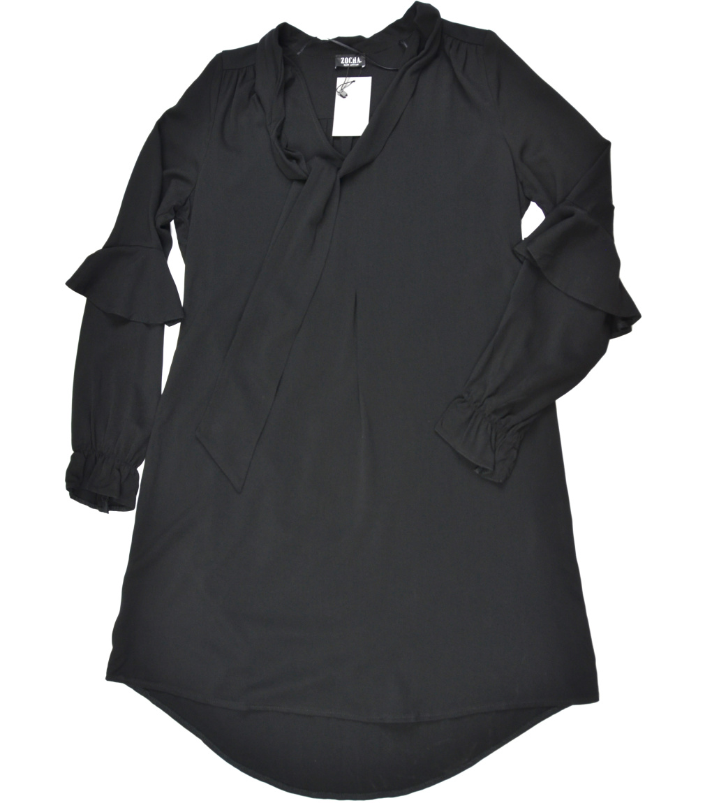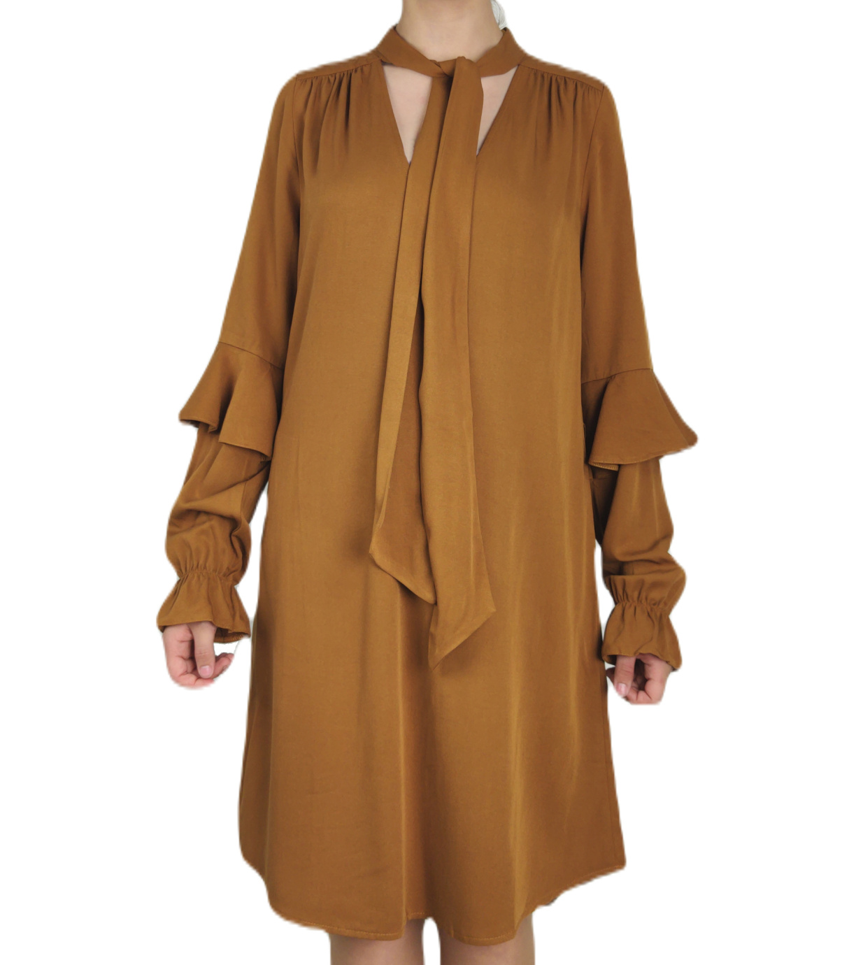 Letnia sukienka damska wykonana jest z lekkiego materiału wiskozowego. Rękawy ozdobione delikatnymi falbankami. Kołnierzyk przechodzi w kokardę, można go również zawiązać w supeł i pozostawić swobodnie wiszący.