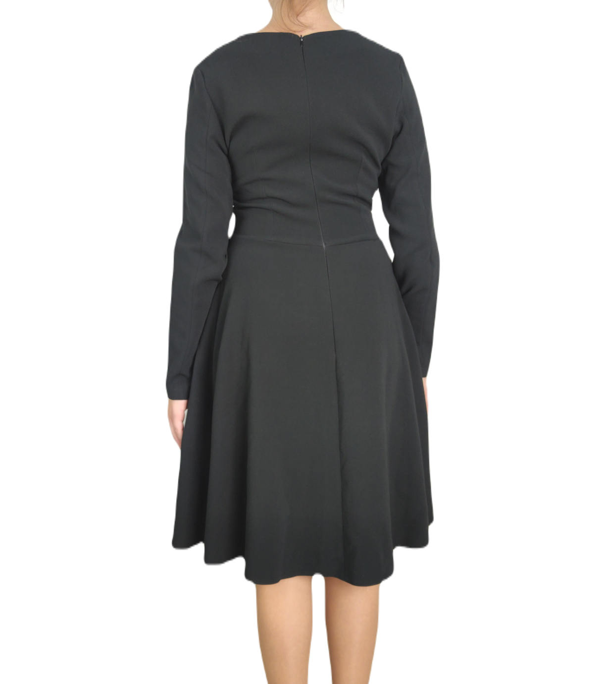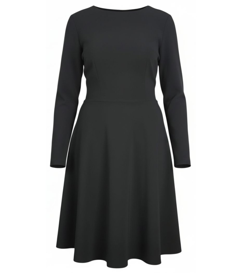 Sukienka damska z długim rękawem. Zapięcie z tyłu. Sukienka odcinana w talii, spódnica stopniowo się poszerza. Wstawki na plecach i na biuście.