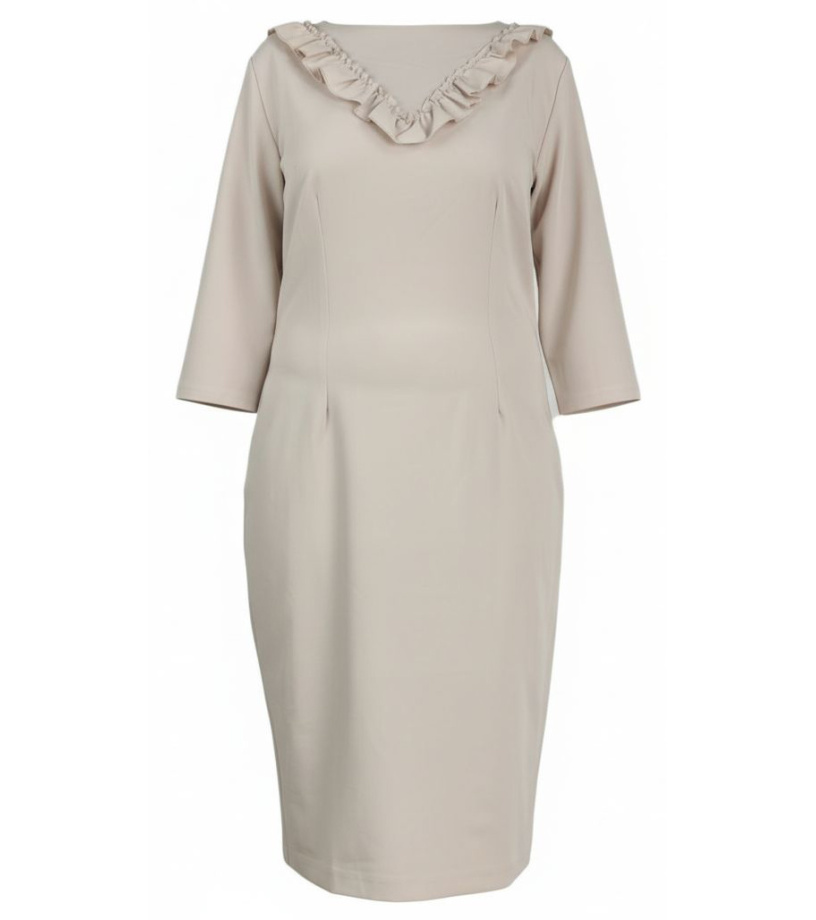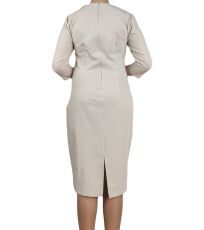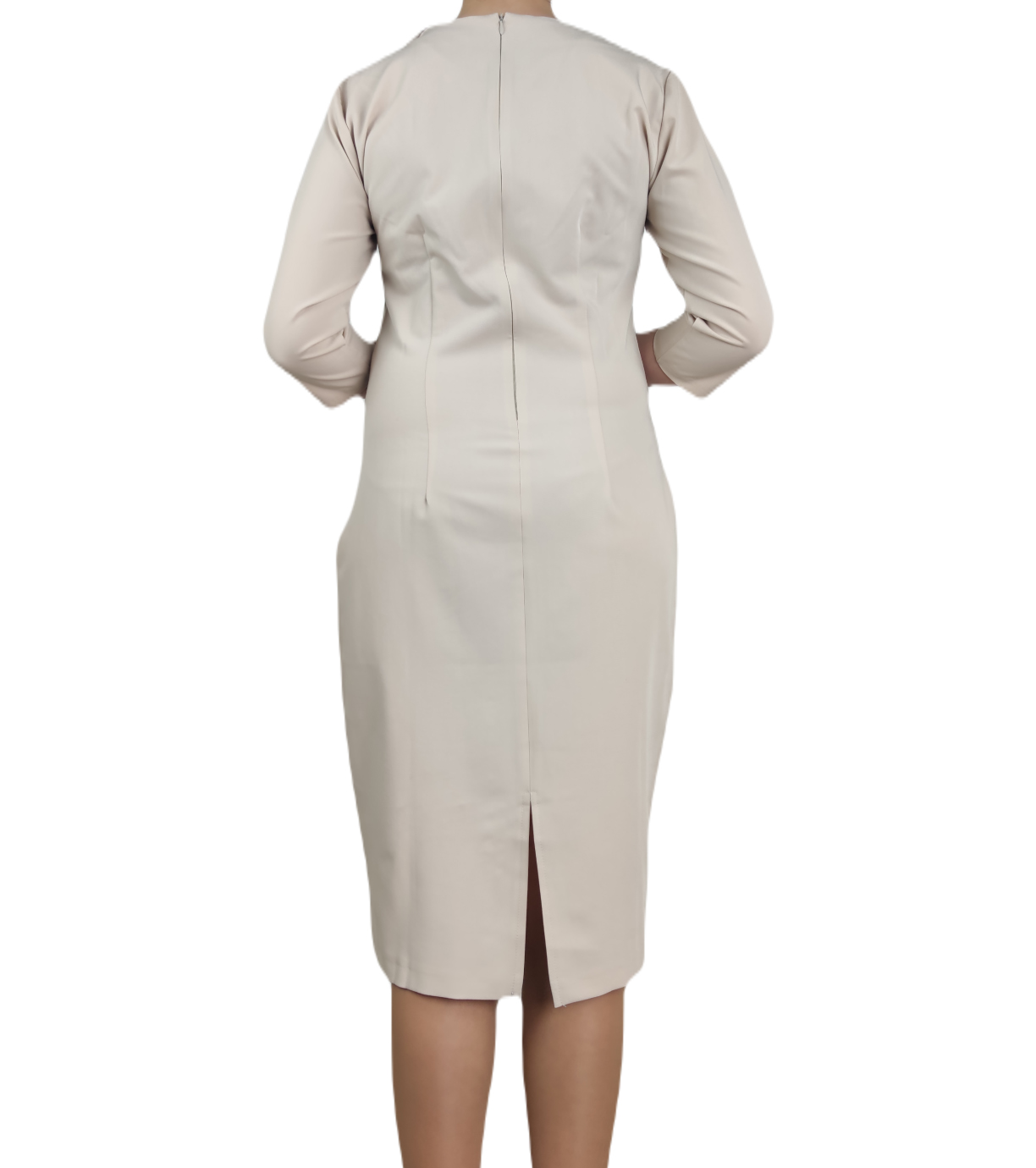Sukienka damska o charakterze towarzyskim ma rękaw 3/4. Sukienka jest lekko dopasowana, długość do kolan. Z przodu znajdują się wstawki, a z tyłu zamek błyskawiczny dla wygodniejszego ubierania. Dekolt okrągły, zdobienia dodają sukience elegancji.