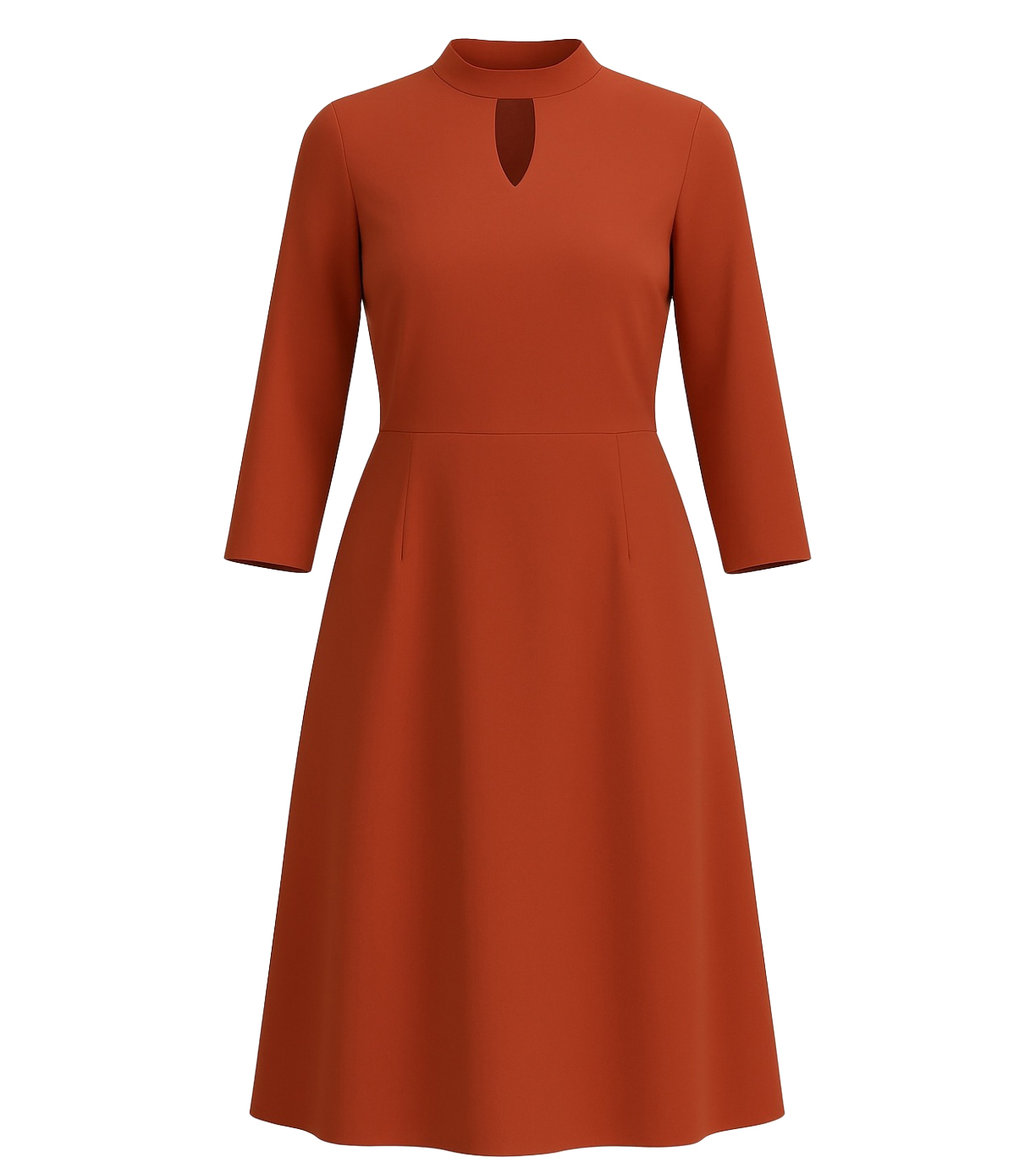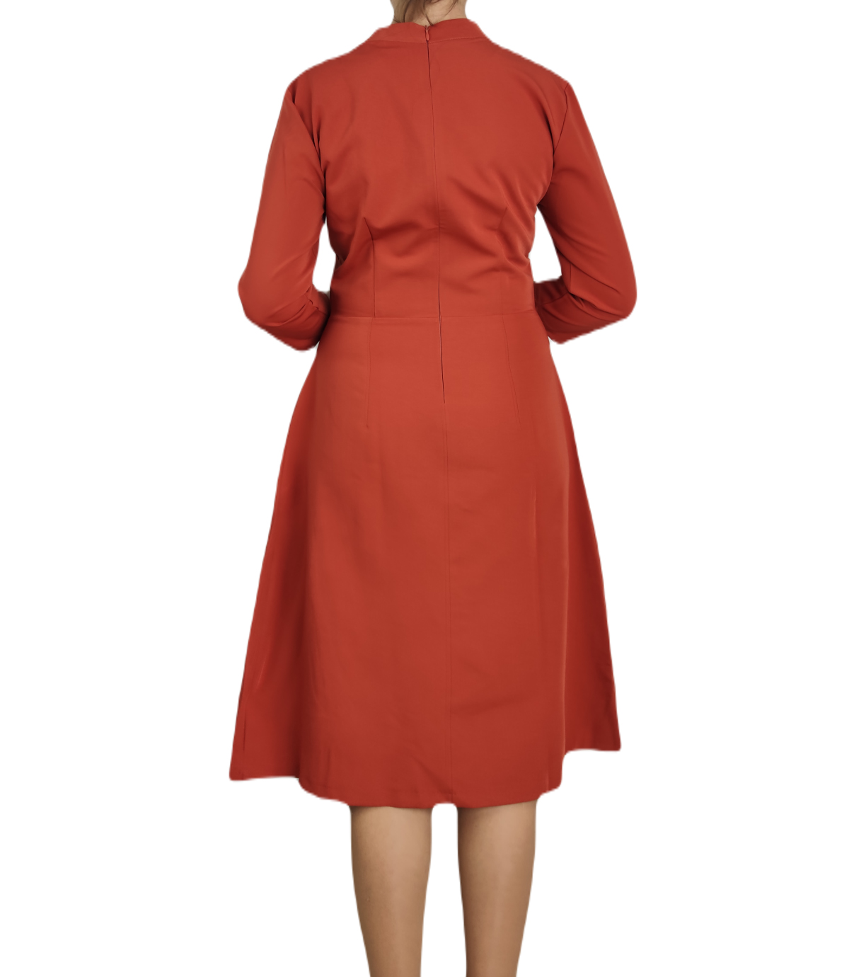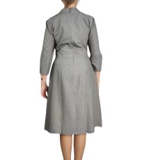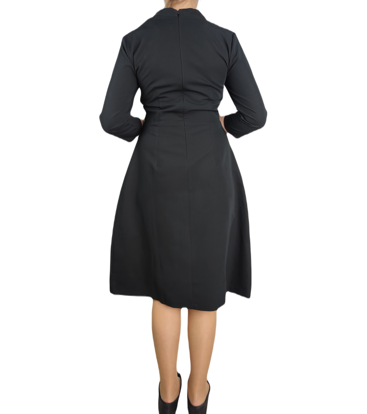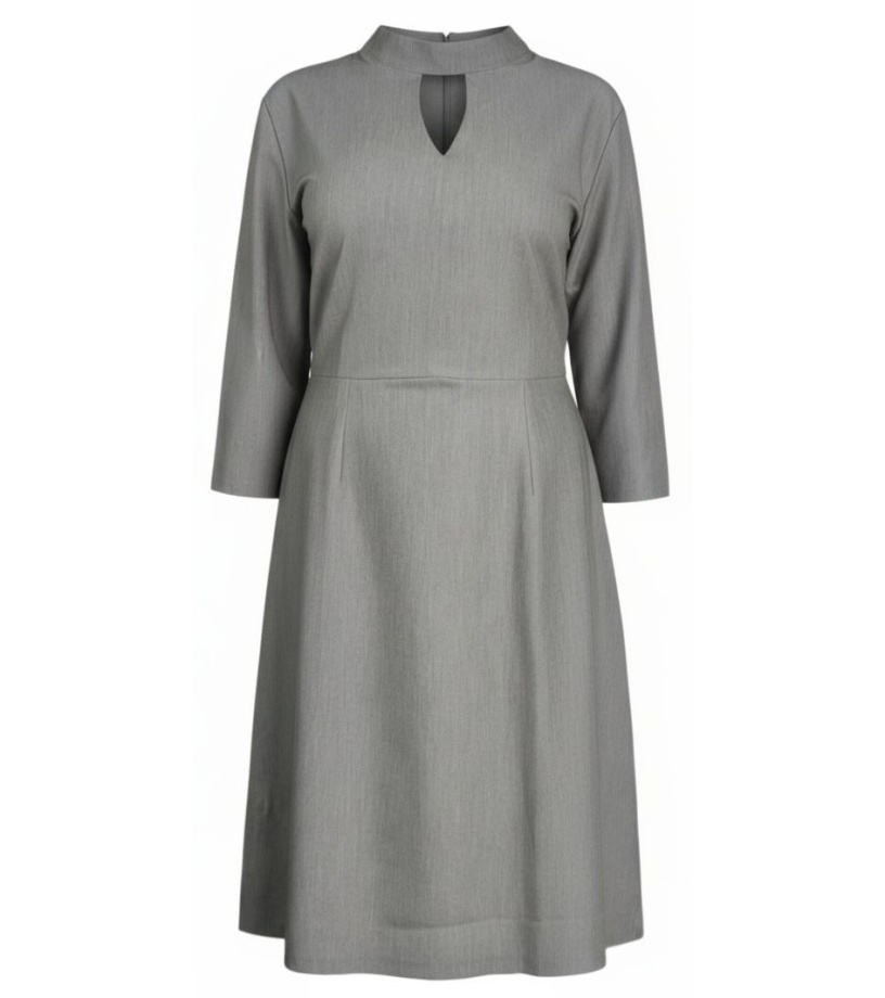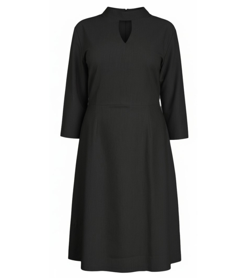 Damska sukienka wizytowa z ozdobnym dekoltem. Zapięcie na zamek. Sukienka ma rękawy 3/4, odcinana w talii i lekko rozkloszowana spódnica.