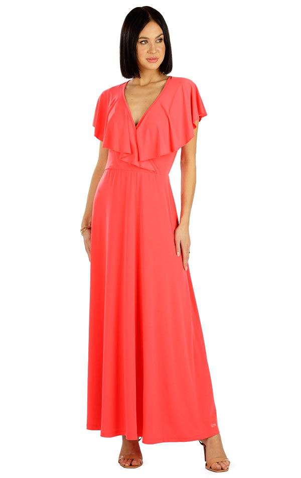 Elegancka sukienka damska z głębokim dekoltem i gumką w pasie. Oryginalny krój z falbanami zakrywającymi ramiona. Lejący i elastyczny, niegniotący się materiał zapewni maksymalnie przyjemne uczucie podczas noszenia. Długość sukienki to ok. 140 cm.