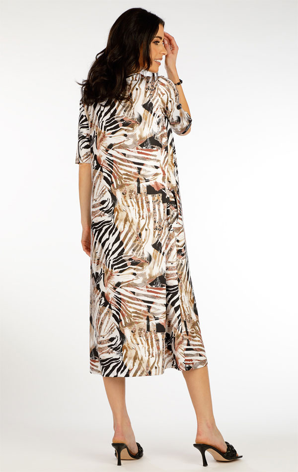 Sukienka damska z krótkimi rękawami. Elegancka sukienka damska z profilowanym dekoltem i sznurkiem do wiązania ozdobnymi wykończeniami. Luźny krój z kieszeniami bocznymi. Materiał z motywem zwierzęcym gwarantuje idealny przepływ powietrza, elastyczność i maksymalny komfort noszenia. Sukienka jest bardzo lekka, wygodna w noszeniu i praktyczna w utrzymaniu. Można nosić z paskiem, który nie jest dołączony do sukienki. Długość sukienki ok. 115 cm.