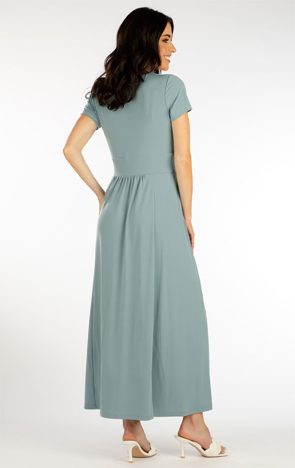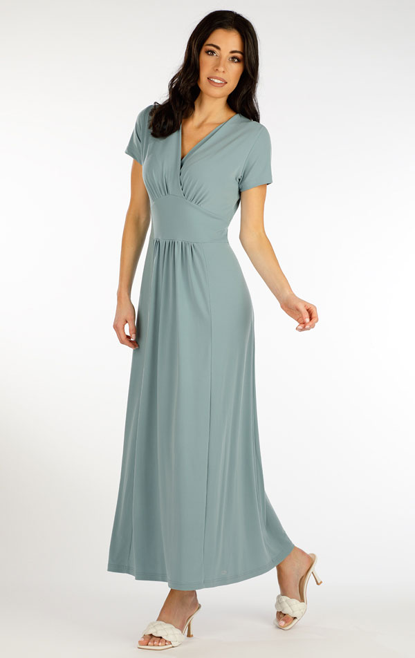 Sukienka damska z krótkimi rękawami. Elegancka sukienka damska z głębokim dekoltem i profilowaną gumką pod biustem, która podkreśla kobiecą sylwetkę. Dół sukienki jest plisowany, co zapewnia wygodę noszenia. Bardzo przyjemny w dotyku i elastyczny materiał, który się nie gniecie, zapewni Ci maksymalny komfort noszenia. Długość sukienki ok. 140cm.