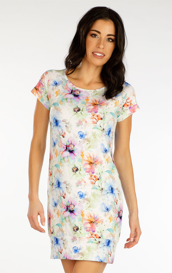 Sukienka damska z krótkimi rękawami. Luźniejszy krój sukienki z dekoltem w łódkę. Długość sukienki wykończona jest szeroką, elastyczną lamówką. Dzianina wiskozowa z domieszką elastanu gwarantuje doskonały przepływ i przyjemne uczucie podczas noszenia. Sukienka stylowo odświeży Twoją letnią garderobę. Długość sukienki ok. 82 cm.