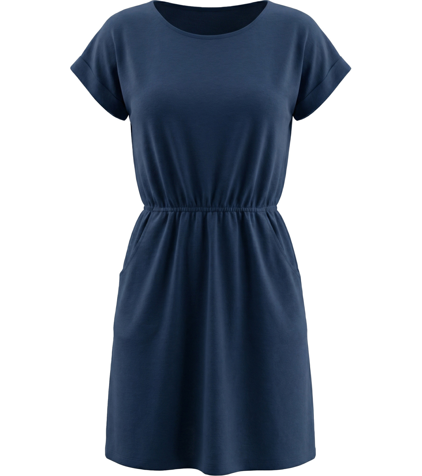 Wygodna sukienka damska w eleganckim, granatowym kolorze o prostym i ponadczasowym fasonie. Krótkie rękawy i okrągły dekolt nadają sukience swobodny charakter, a gumka w pasie ze sznurkiem delikatnie podkreśla sylwetkę i zapewnia wygodę. Miękki, lejący materiał jest przyjemny w dotyku i nadaje się do całodziennego noszenia. Praktyczne kieszenie boczne zwiększają funkcjonalność. Idealny wybór na co dzień, do miasta lub na nieformalne spotkania.