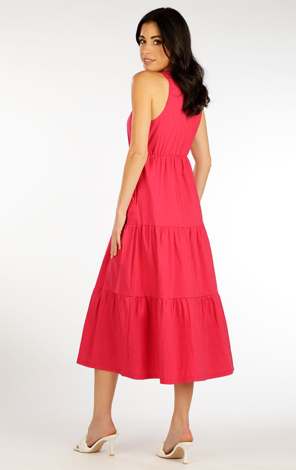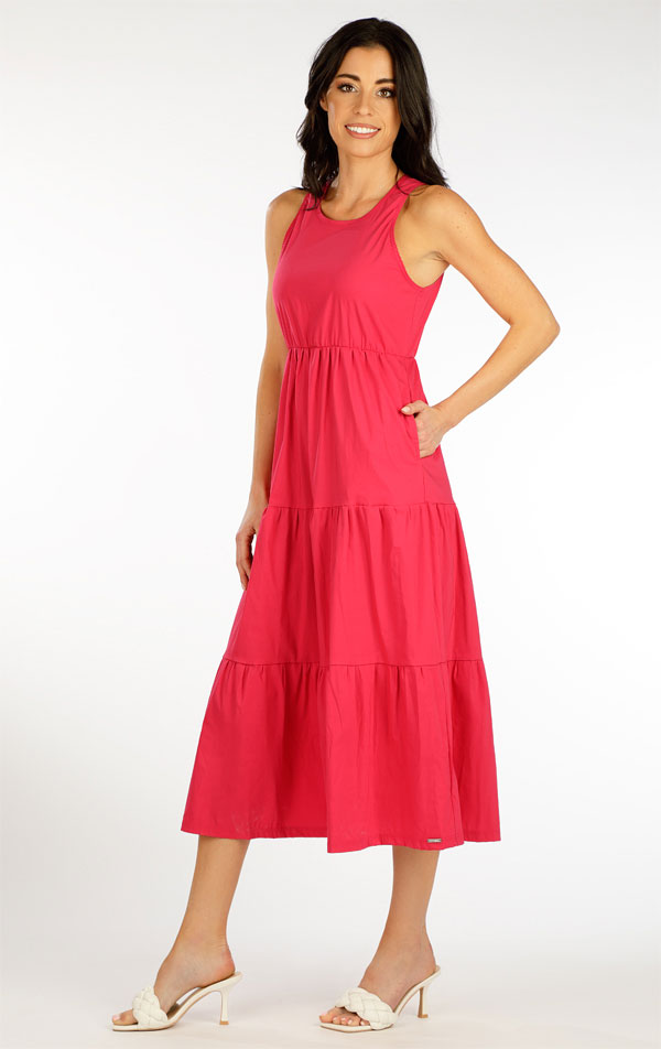 Damska sukienka o luźnym kroju i z kieszeniami bocznymi. Sukienka ma okrągły dekolt i bardziej otwarte otwory na ręce, co zapewnia swobodę ruchów. Materiał z dużą zawartością bawełny, który gwarantuje oddychalność i wysoki komfort noszenia. Lekki i elastyczny materiał. Długość sukienki ok. 120cm.