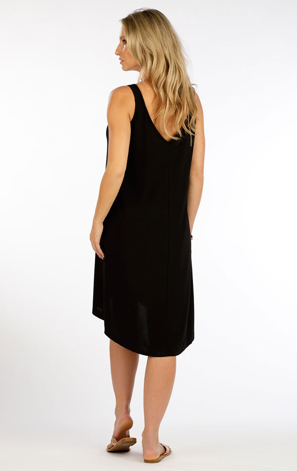 Lekka sukienka damska o popularnym, luźnym kroju z szerszymi ramiączkami i srebrnym, ozdobnym detalem. Przód zdobi delikatne marszczenie przy dekolcie. Tył ma głębszy dekolt w serek i jest lekko przedłużony, co nadaje sukience zwiewności i kobiecego charakteru. Wygodny krój zapewnia wygodę przez cały dzień. Nadaje się również jako stylowa sukienka plażowa. Lekka i elastyczna mieszanka poliestru i elastanu zapewnia wygodę, łatwość pielęgnacji i niską podatność na zagniecenia. Długość: ok. 105 cm.