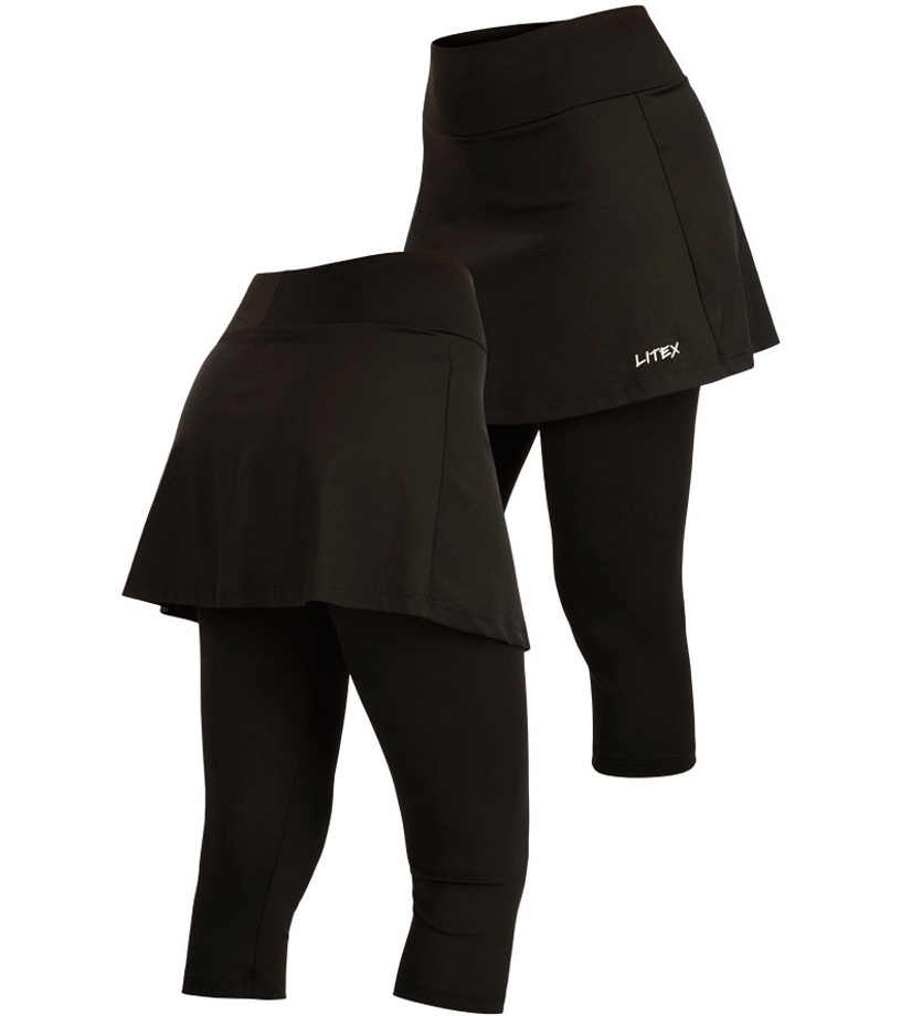 Funkcjonalne legginsy o długości 3/4 ze spódniczką. Spódnica z wbudowanymi legginsami, długość za kolano. Wygodna, szeroka, elastyczna talia. Materiał jest elastyczny, szybko schnie i zapewnia maksymalny komfort noszenia. Uniwersalne zastosowanie.
