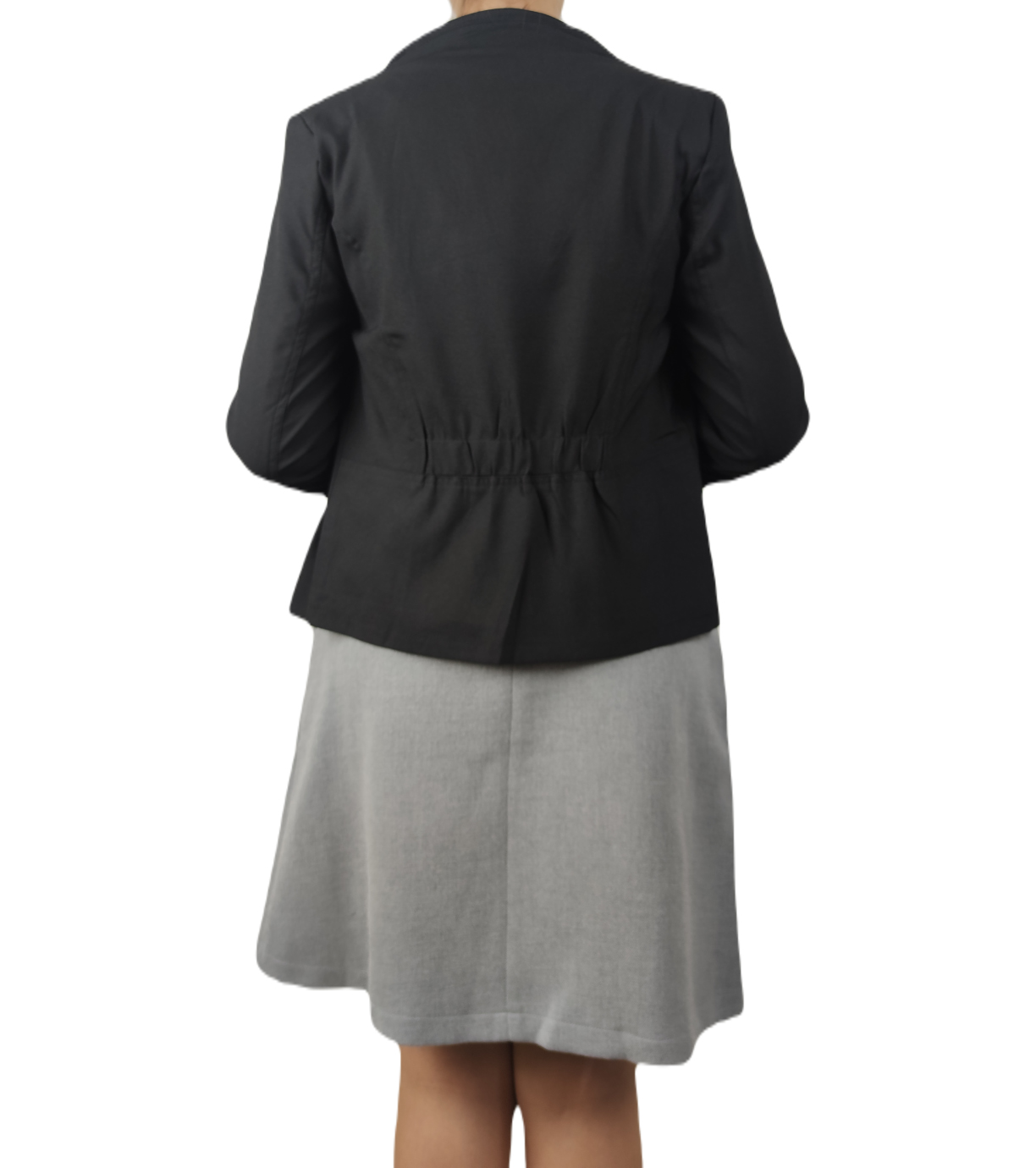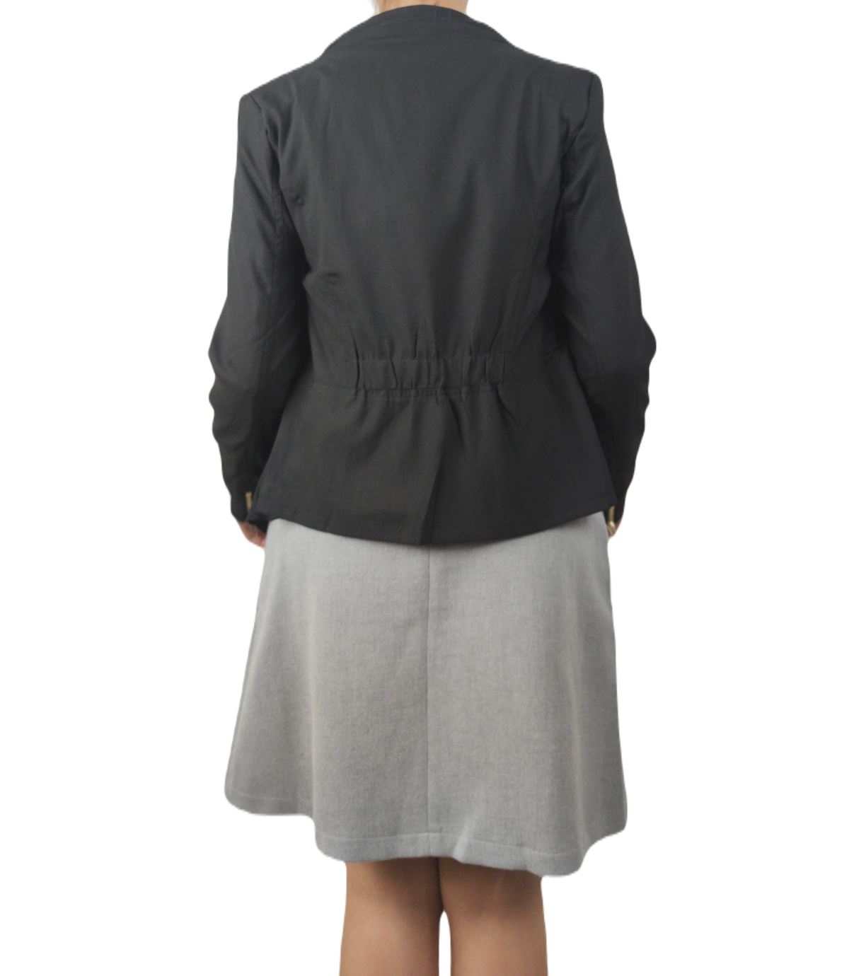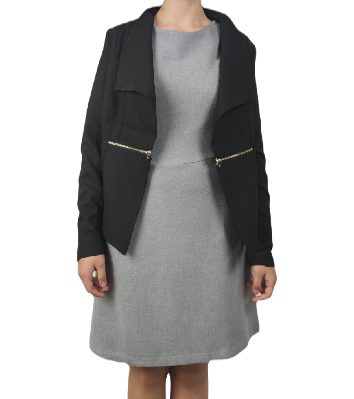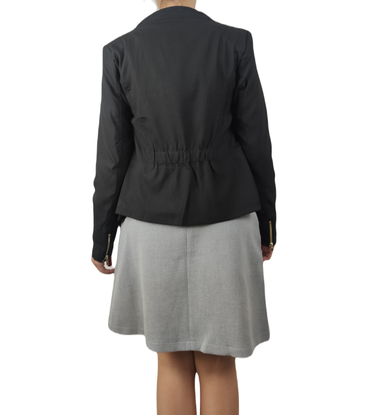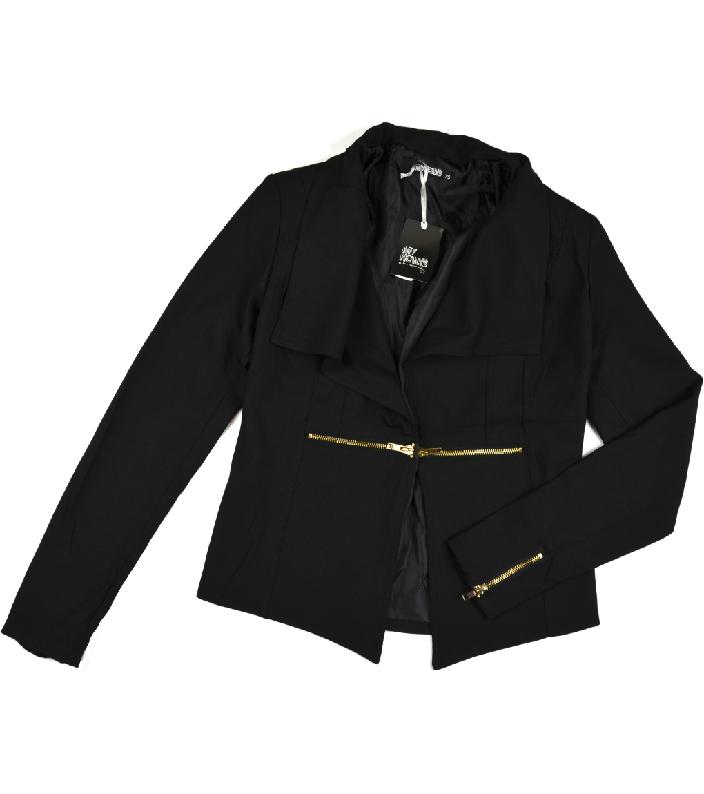 Modna kurtka damska. Lekko dopasowana, plisowana z tyłu. W miejscu kieszeni znajdują się ozdobne, złote zamki. Rękawy są również wykończone zamkami błyskawicznymi.