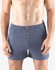 Luźne bokserki, męska bielizna szyta. W pasie wszyta jest szersza gumka. Nogawki są wykończone przez obszywanie. Z przodu rozporek na 2 guziki. Tylna część przedzielona centralnym szwem. Bokserki są jednokolorowe.