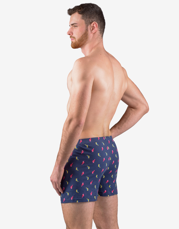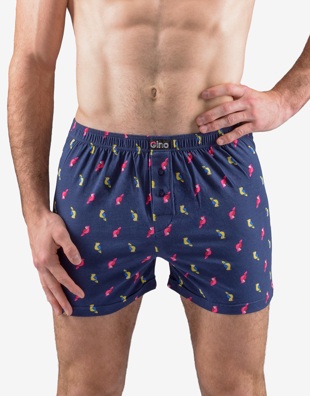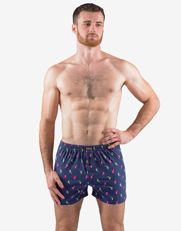 Luźne bokserki, bielizna męska dopasowana. W pasie wszyta jest szersza gumka. Z przodu znajduje się rozcięcie na 2 guziki. Tylna część jest przedzielona centralnym szwem. Bokserki mają nadruk w odważniejszy wzór.