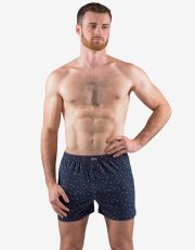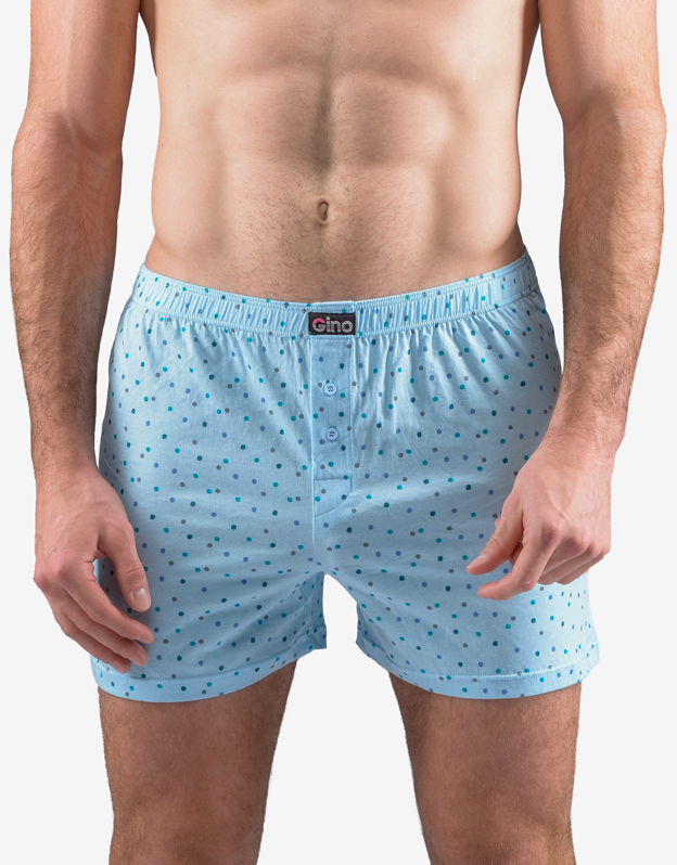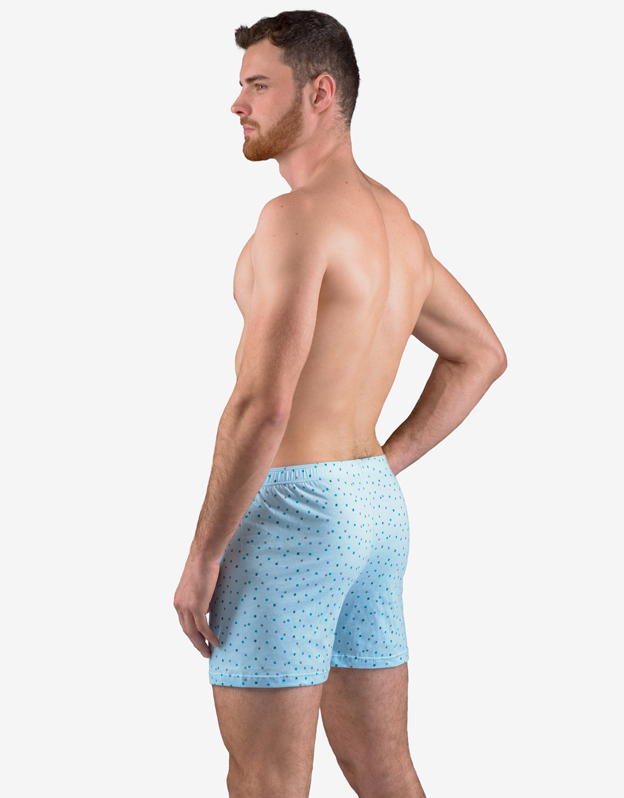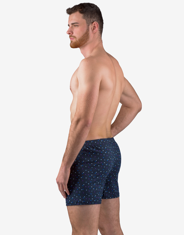 Męskie luźne bokserki, bielizna męska dopasowana. W pasie wszyta jest szersza gumka. Z przodu znajduje się rozcięcie na 2 guziki. Tylna część jest przedzielona centralnym szwem. Bokserki mają nadruk w drobny wzór.