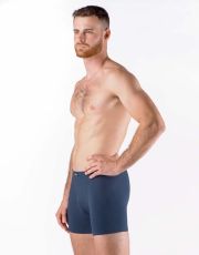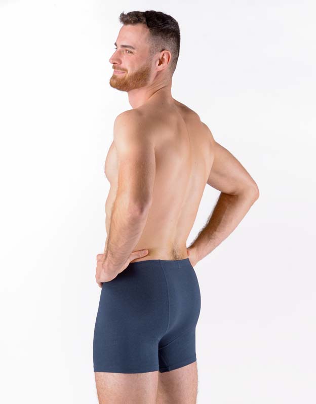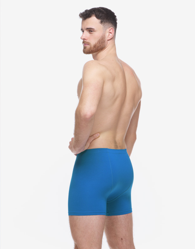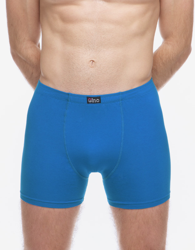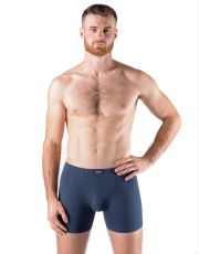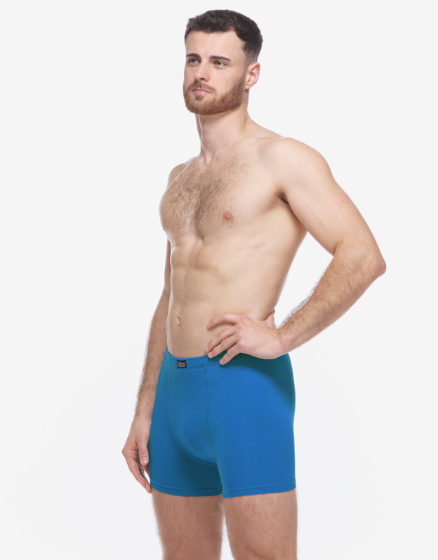 Bokserki z dłuższymi nogawkami, bielizna męska szyta. W pasie wszyta jest szersza gumka. Tylna część przedzielona klinem z dwoma szwami. Bokserki są jednokolorowe.