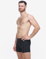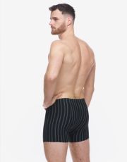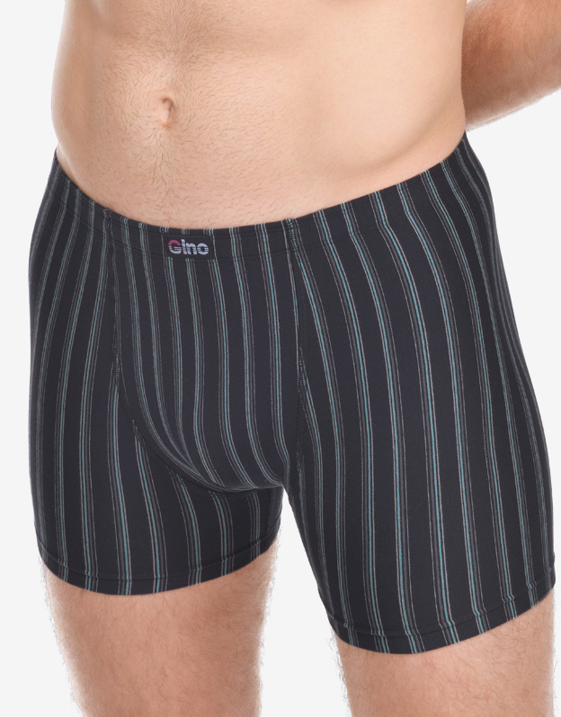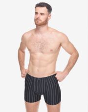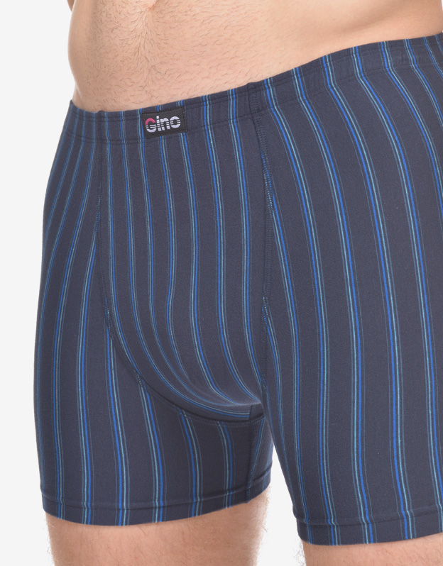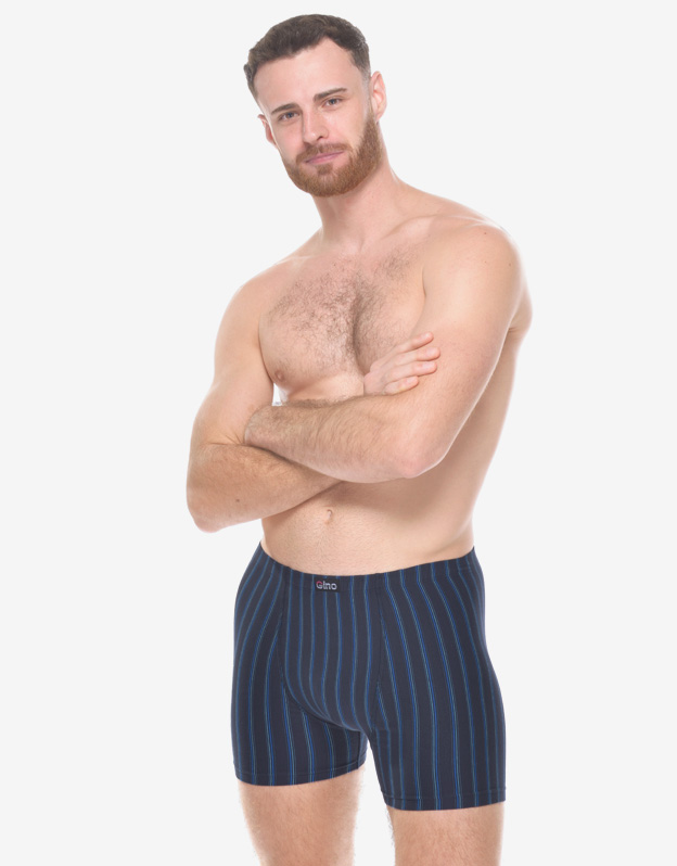 Męskie bokserki z dłuższymi nogawkami, z tylną częścią podzieloną dwoma szwami, wykonane są z dzianiny bawełnianej z dodatkiem włókien elastanu. Materiał ten ma dzianinowy wzór w paski, jest elastyczny i wygodny w codziennym noszeniu.