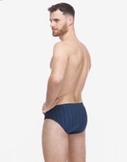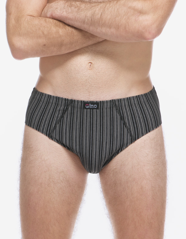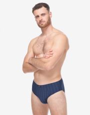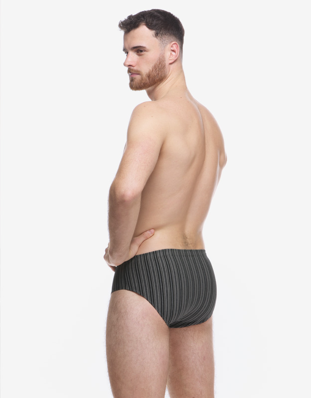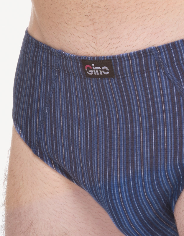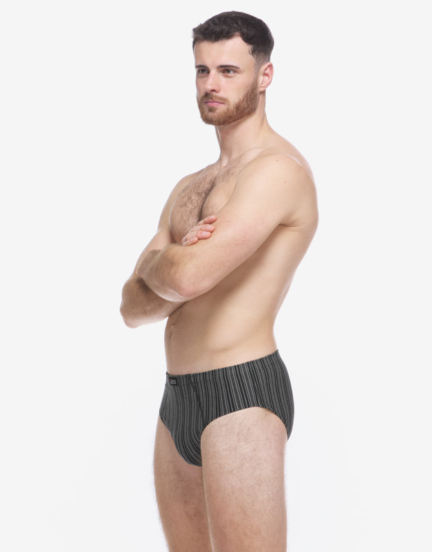 Slipy z szerszym bokiem, męska bielizna szyta. W pasie wszyta szersza gumka. W nogawkach wszyta wąska gumka. Majtki wykonane są z materiału z dzianinowymi paskami.