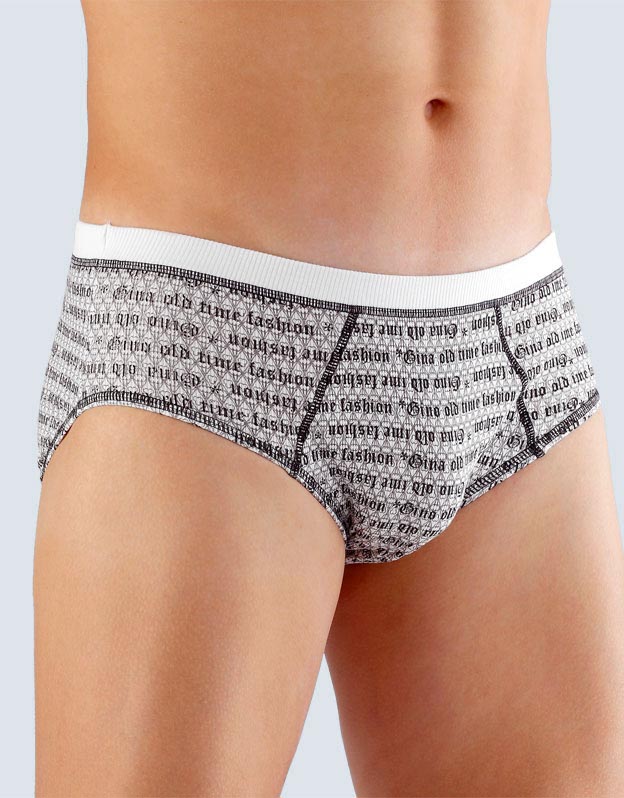 Slipy o szerszym boku, bielizna męska szyta. W pasie wszyta jest szersza gumka. W nogawkach wszyta jest wąska gumka. Slipy mają nadrukowany wyraźny wzór.