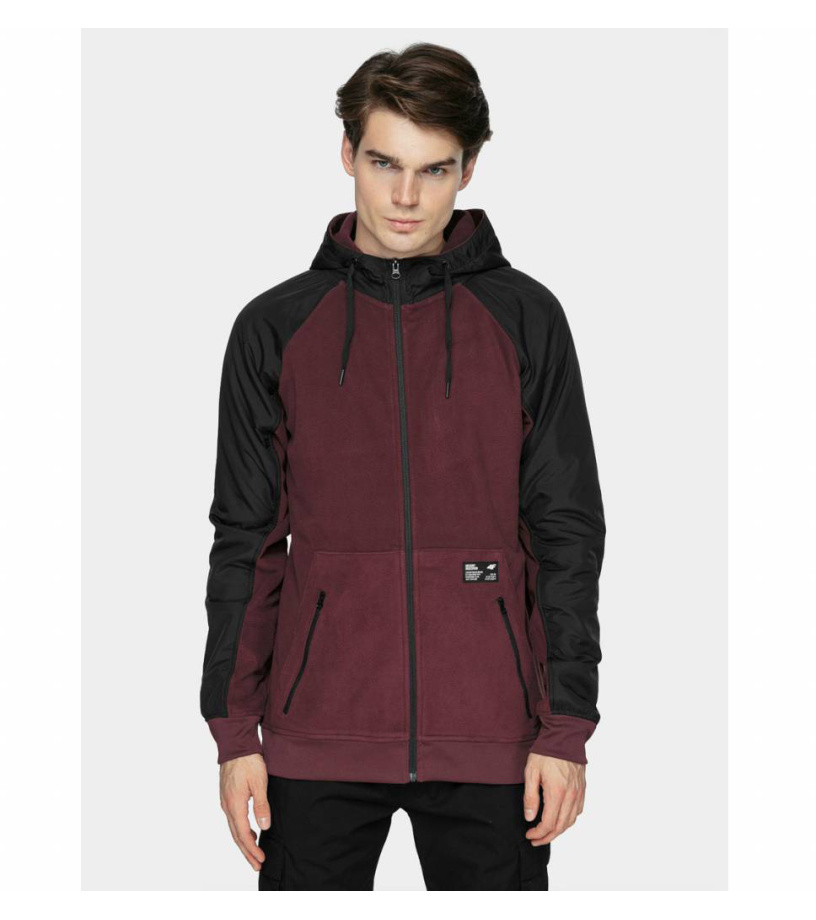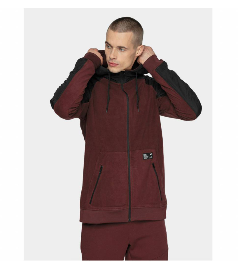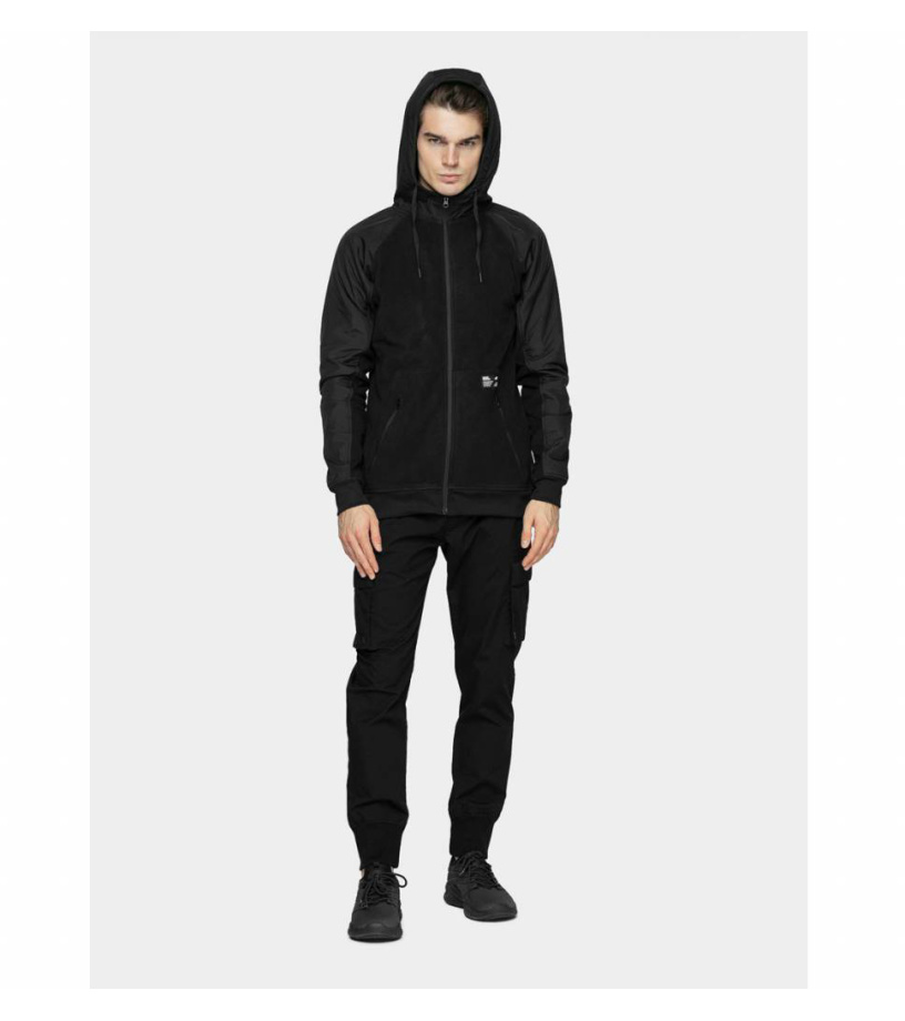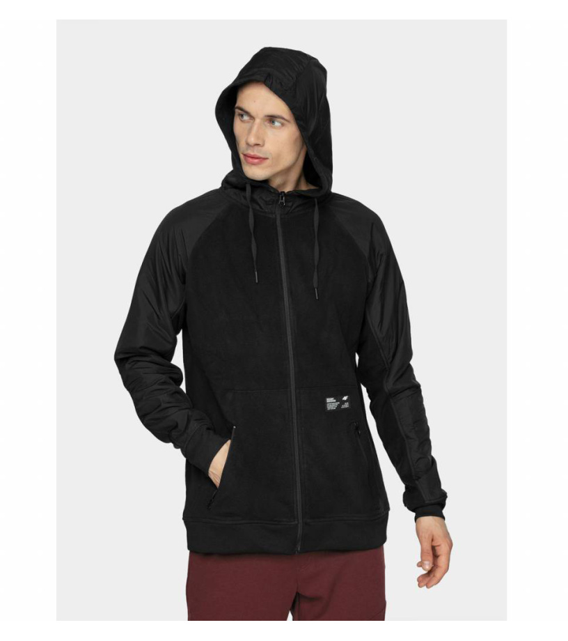 Męska hybrydowa bluza z kapturem na zamek z przyjemnym polarowym materiałem z nakładkami, które chronią przed uderzeniami i uzupełniają design bluzy. Zastosowano technologię 4FWarm, która doskonale chroni przed zimnem. Kaptur z wyższym kołnierzem i sznurkiem służącym do dowolnej regulacji. Kieszenie boczne zapinane na zamek. Prążkowany dół i mankiety rękawów.