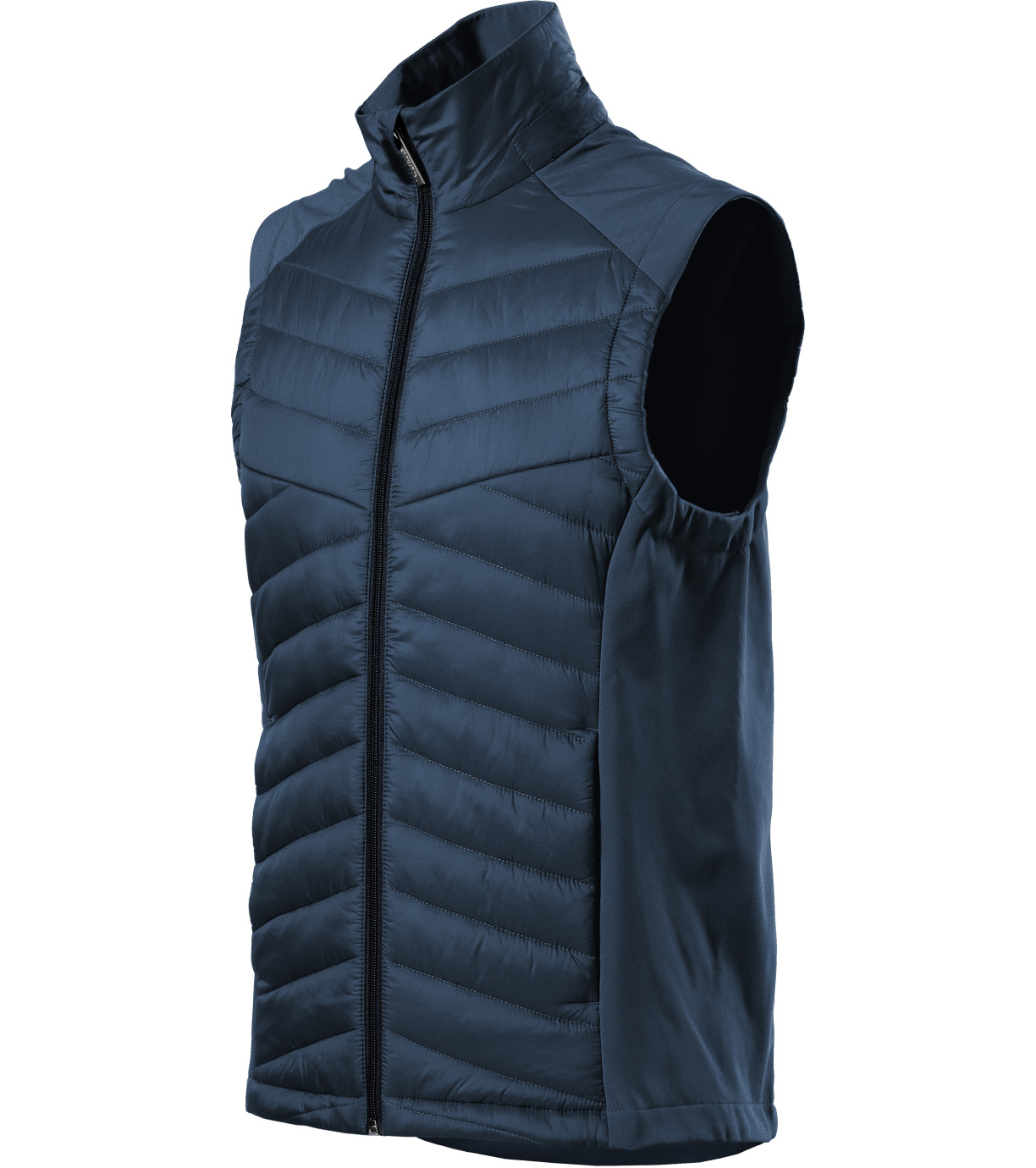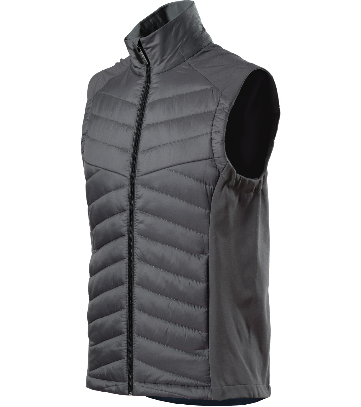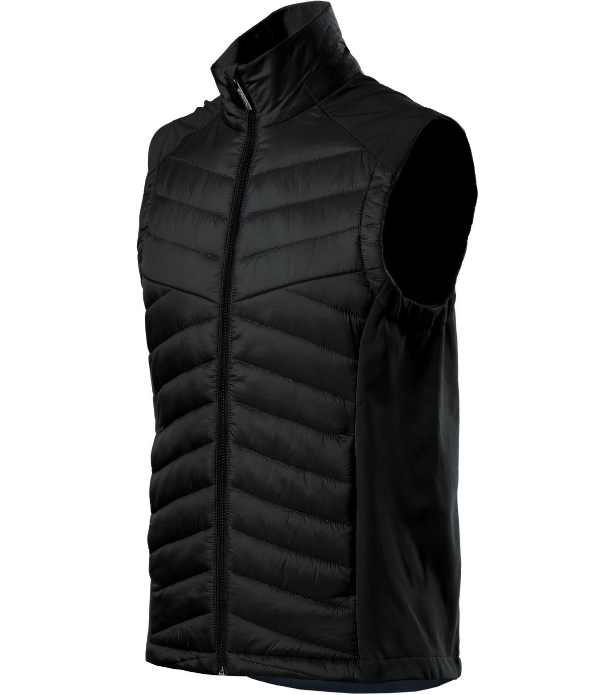 Męska kamizelka hybrydowa, kombinacja materiału pikowanego i softshell, prosty krój z panelami bocznymi, spiralny zamek błyskawiczny na całej długości z osłoną podbródka, kieszenie boczne zapinane na spiralny zamek błyskawiczny, wewnętrzna kieszeń na piersi zapinana na zamek błyskawiczny, wyprofilowany i lekko przedłużony tył, otwór na logo w tylnej podszewce.