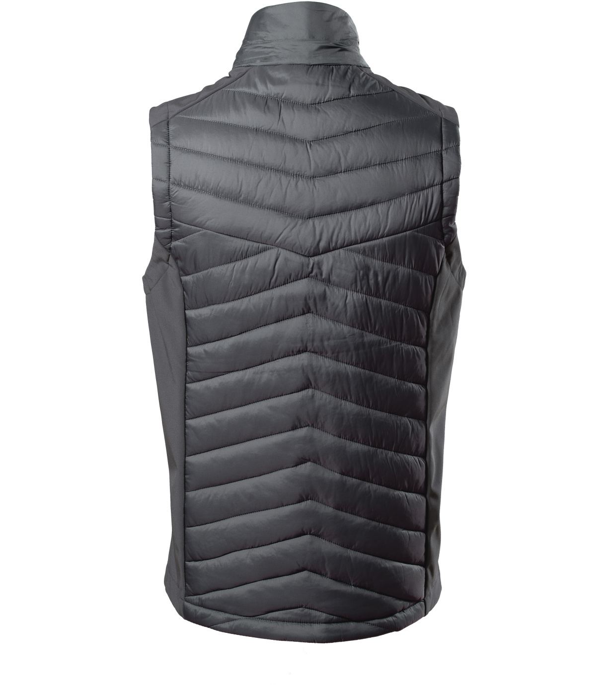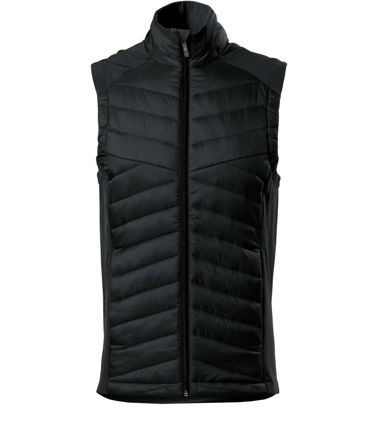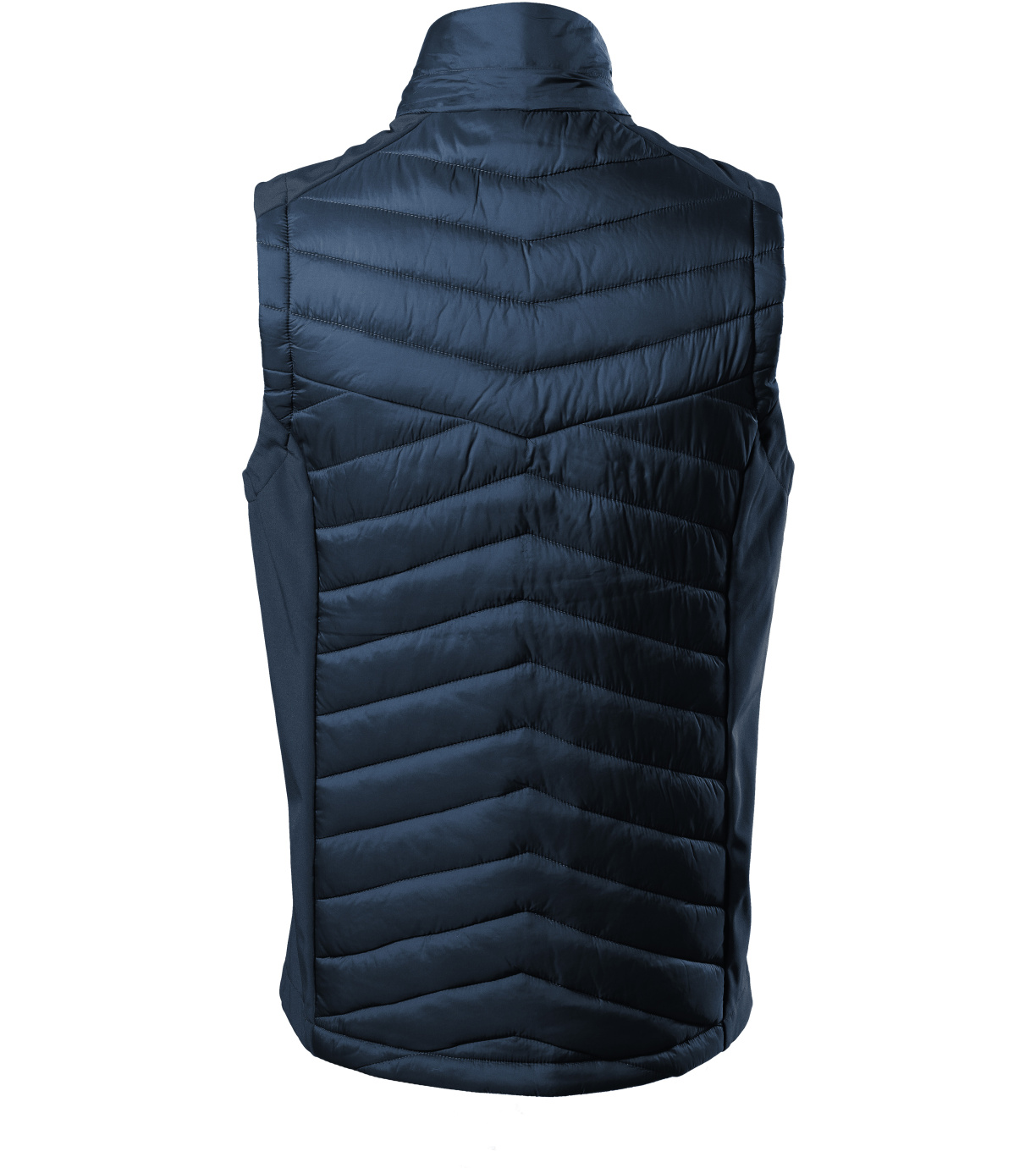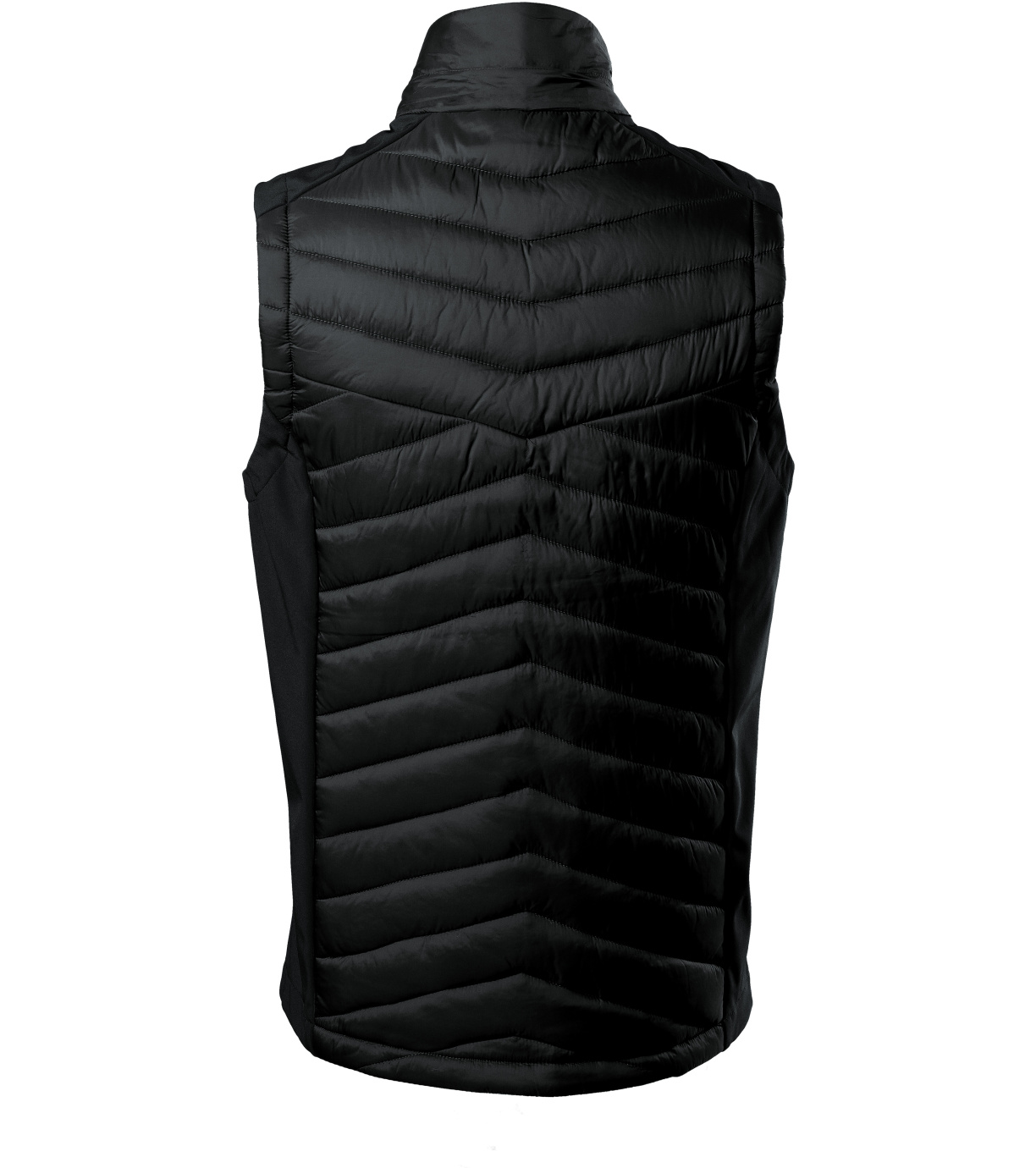 Męska kamizelka hybrydowa, kombinacja materiału pikowanego i softshell, prosty krój z panelami bocznymi, spiralny zamek błyskawiczny na całej długości z osłoną podbródka, kieszenie boczne zapinane na spiralny zamek błyskawiczny, wewnętrzna kieszeń na piersi zapinana na zamek błyskawiczny, wyprofilowany i lekko przedłużony tył, otwór na logo w tylnej podszewce.