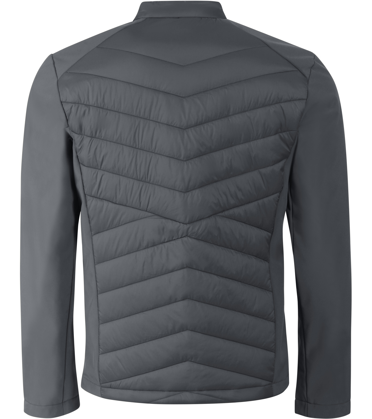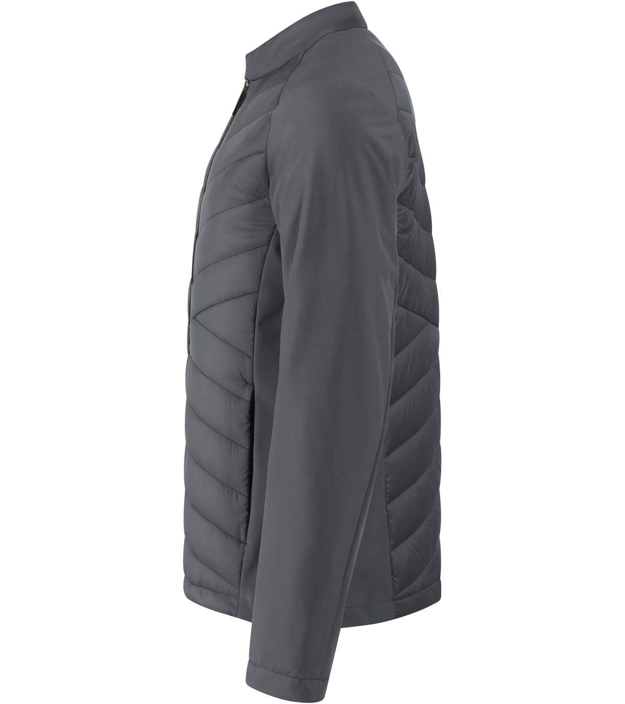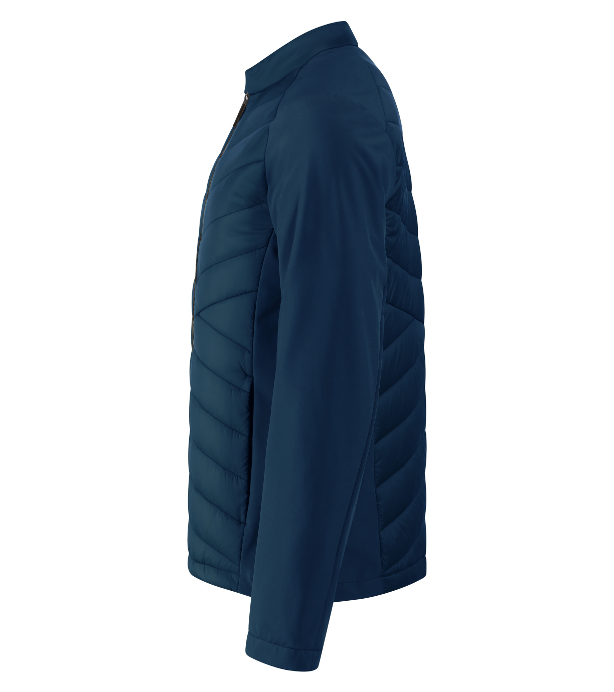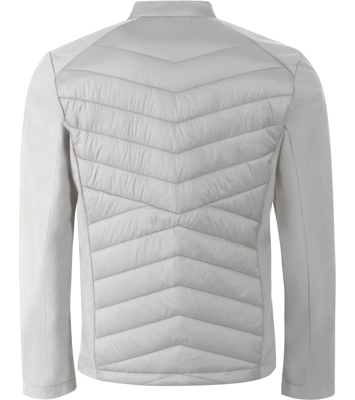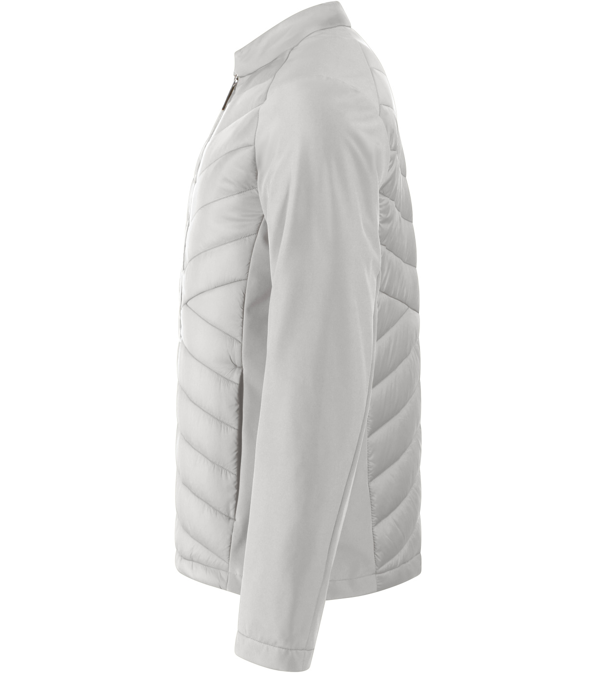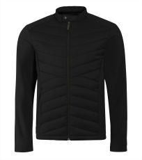 Kombinacja materiału pikowanego i softshell, prosty krój z panelami bocznymi, stójka z napami, spiralny zamek błyskawiczny na całej długości, kieszenie boczne z spiralnymi zamkami, wewnętrzna kieszeń na piersi z zamkiem błyskawicznym, otwór na logo na podszewce z tyłu.