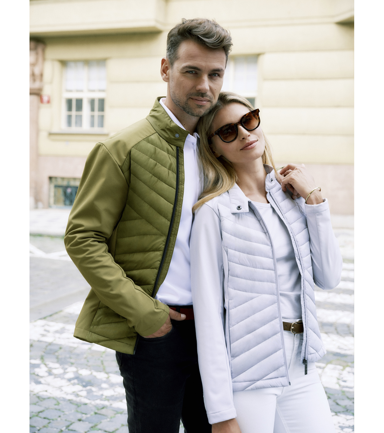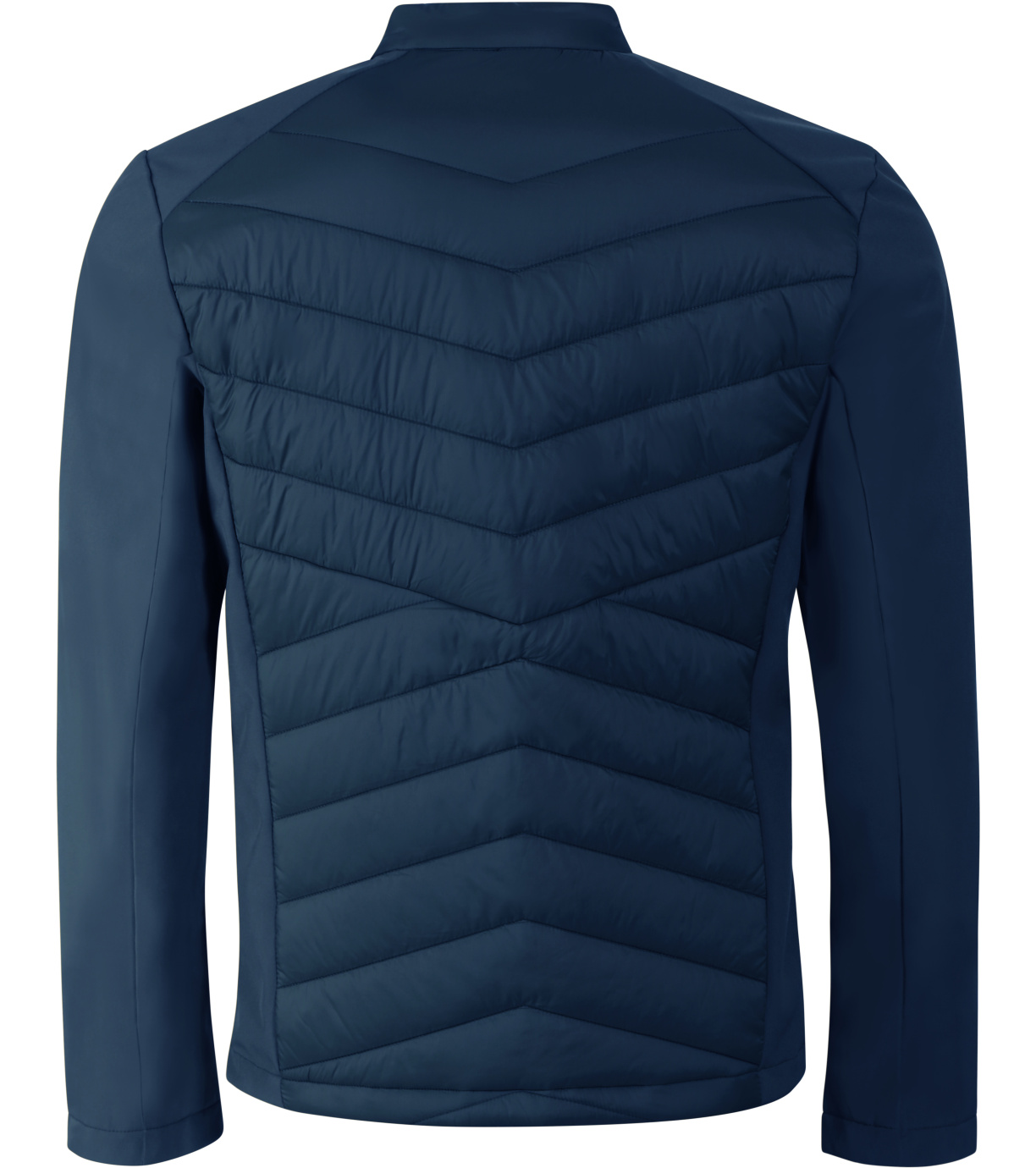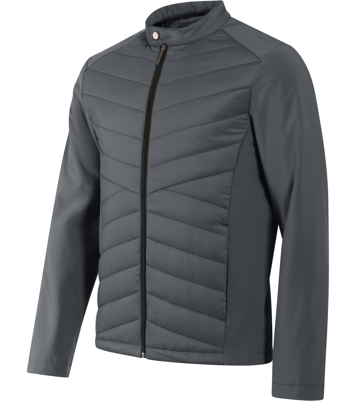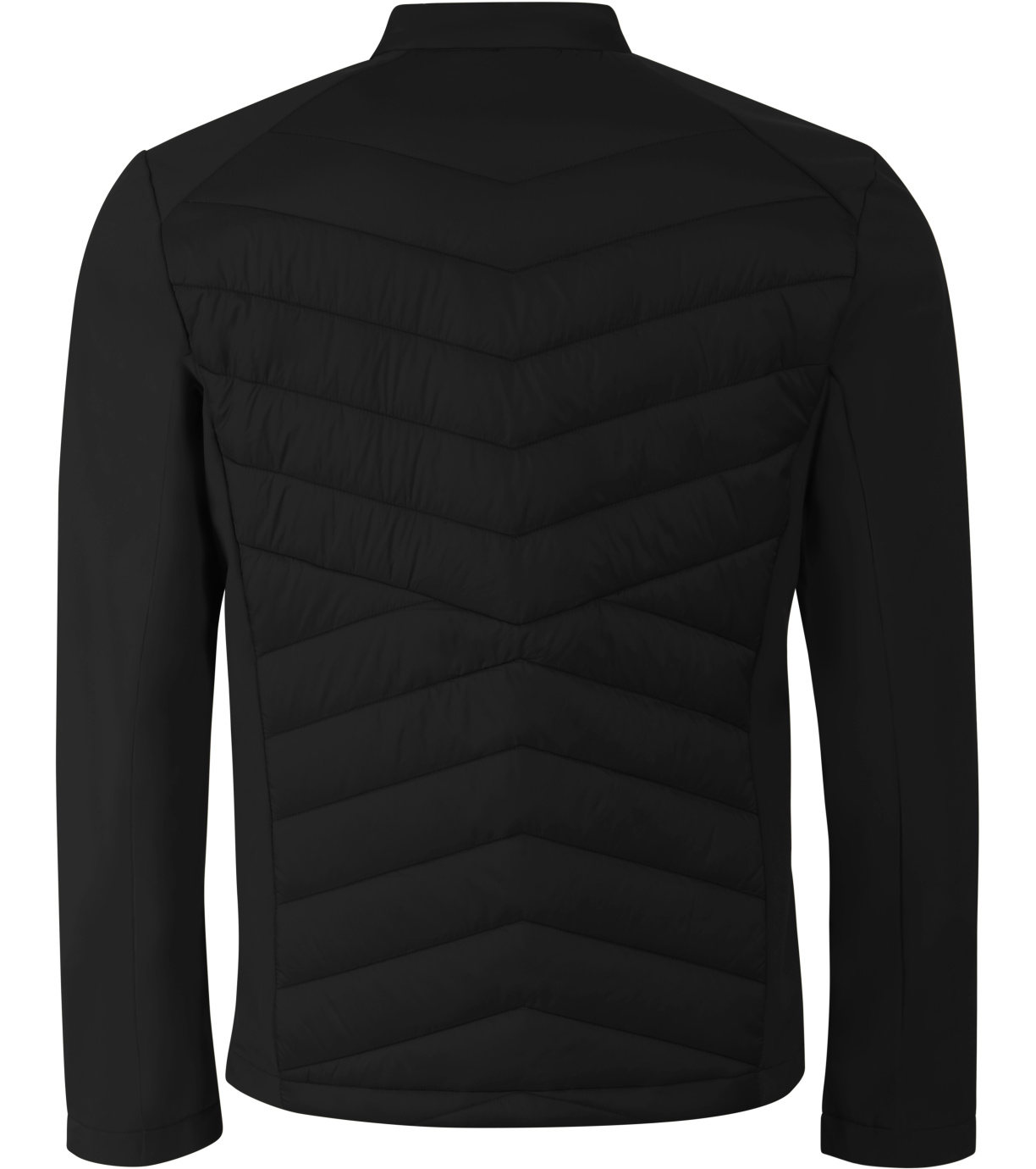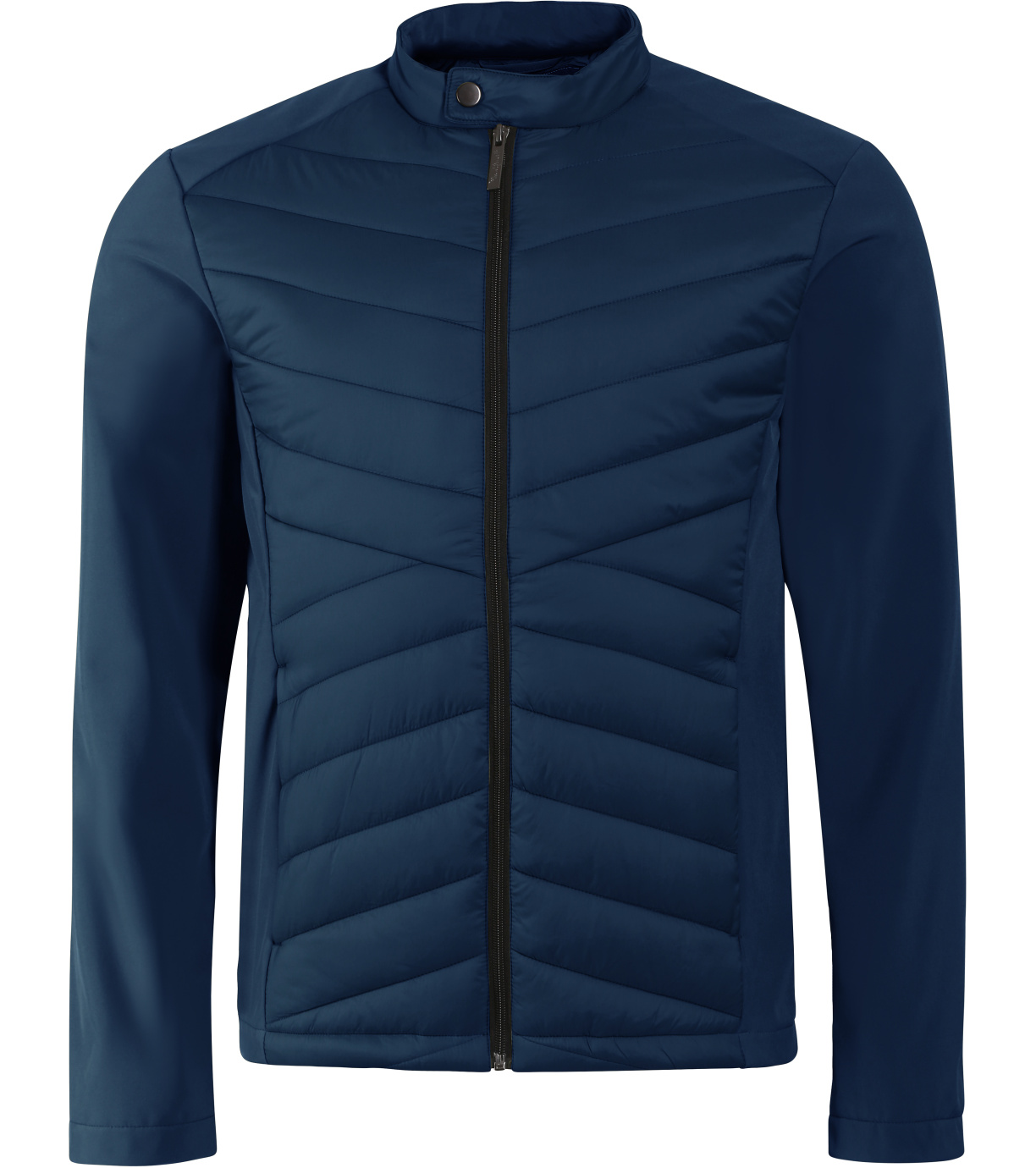 Kombinacja materiału pikowanego i softshell, prosty krój z panelami bocznymi, stójka z napami, spiralny zamek błyskawiczny na całej długości, kieszenie boczne z spiralnymi zamkami, wewnętrzna kieszeń na piersi z zamkiem błyskawicznym, otwór na logo na podszewce z tyłu.