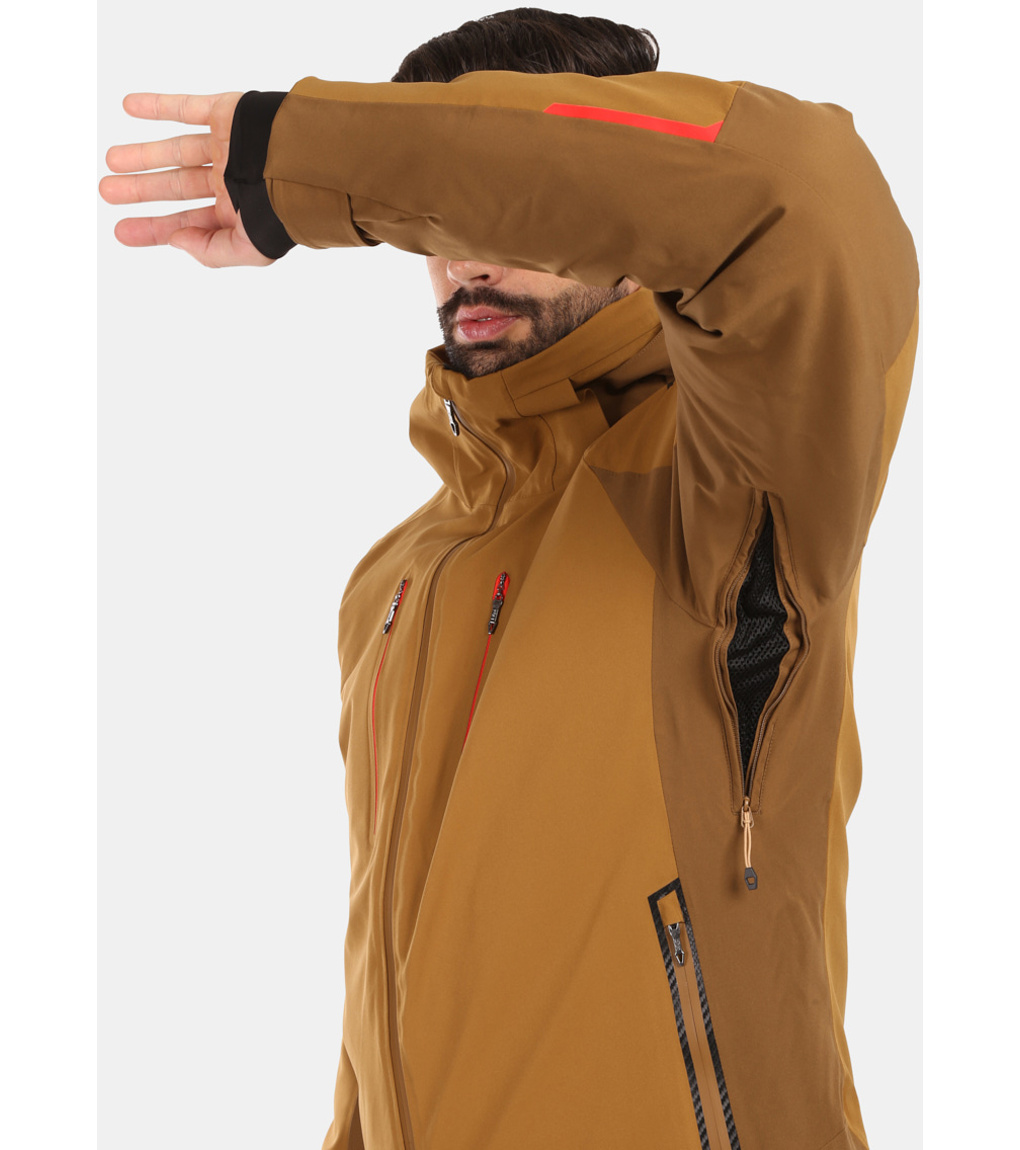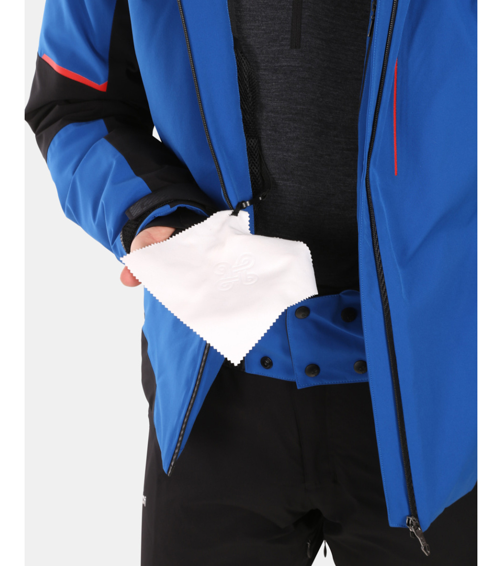 W pełni klejone szwy i wodoodporne zamki błyskawiczne zapewniają doskonałą ochronę przed wilgocią, a długie suwaki wentylacyjne pod pachami zapewniają wentylację podczas intensywnej aktywności lub w cieplejsze dni. Praktyczne kieszenie, w tym kieszeń na rękawie na karnet narciarski, wewnętrzna kieszeń na zamek błyskawiczny i kieszeń z siateczki ze ściereczką do gogli, zapewniają mnóstwo miejsca na niezbędne drobiazgi. Odpinany kaptur ze wzmocnionym daszkiem, kołnierz śnieżny, mankiety rękawów oraz regulacja dołu na rzep zapewniają maksymalny komfort i ochronę. Bezpieczeństwo zwiększa zintegrowany element RECCO, który zwiększa szanse na znalezienie w razie wypadku w terenie.