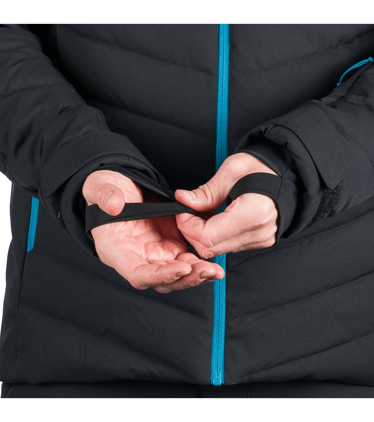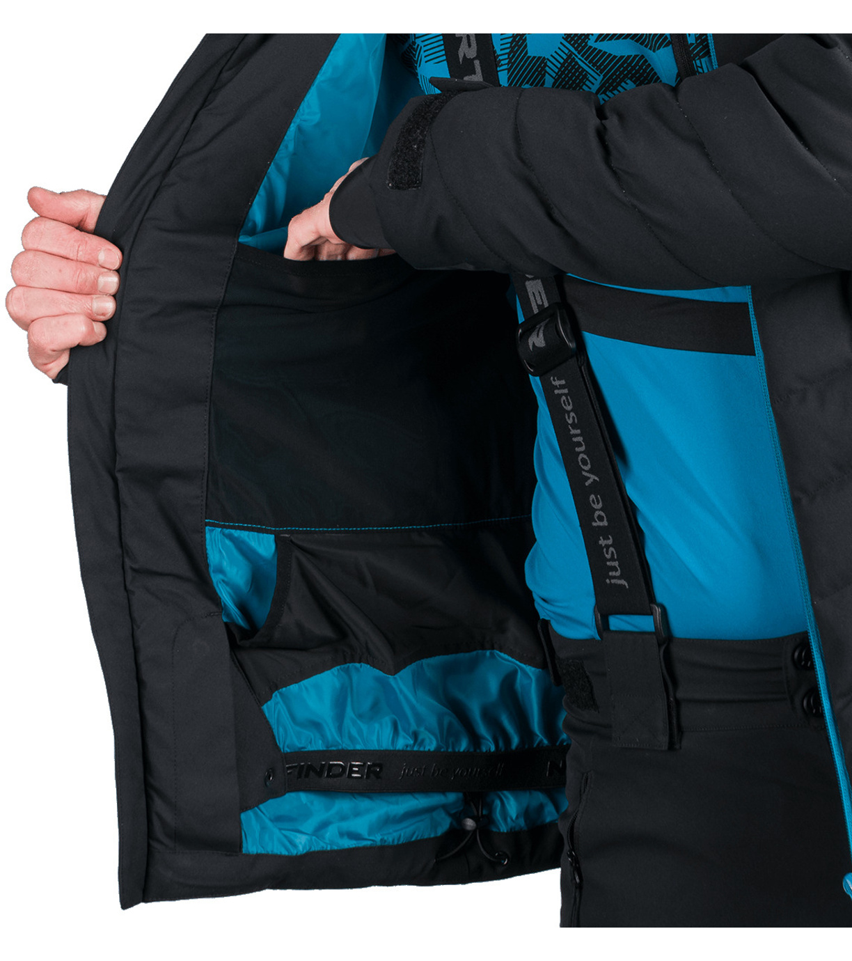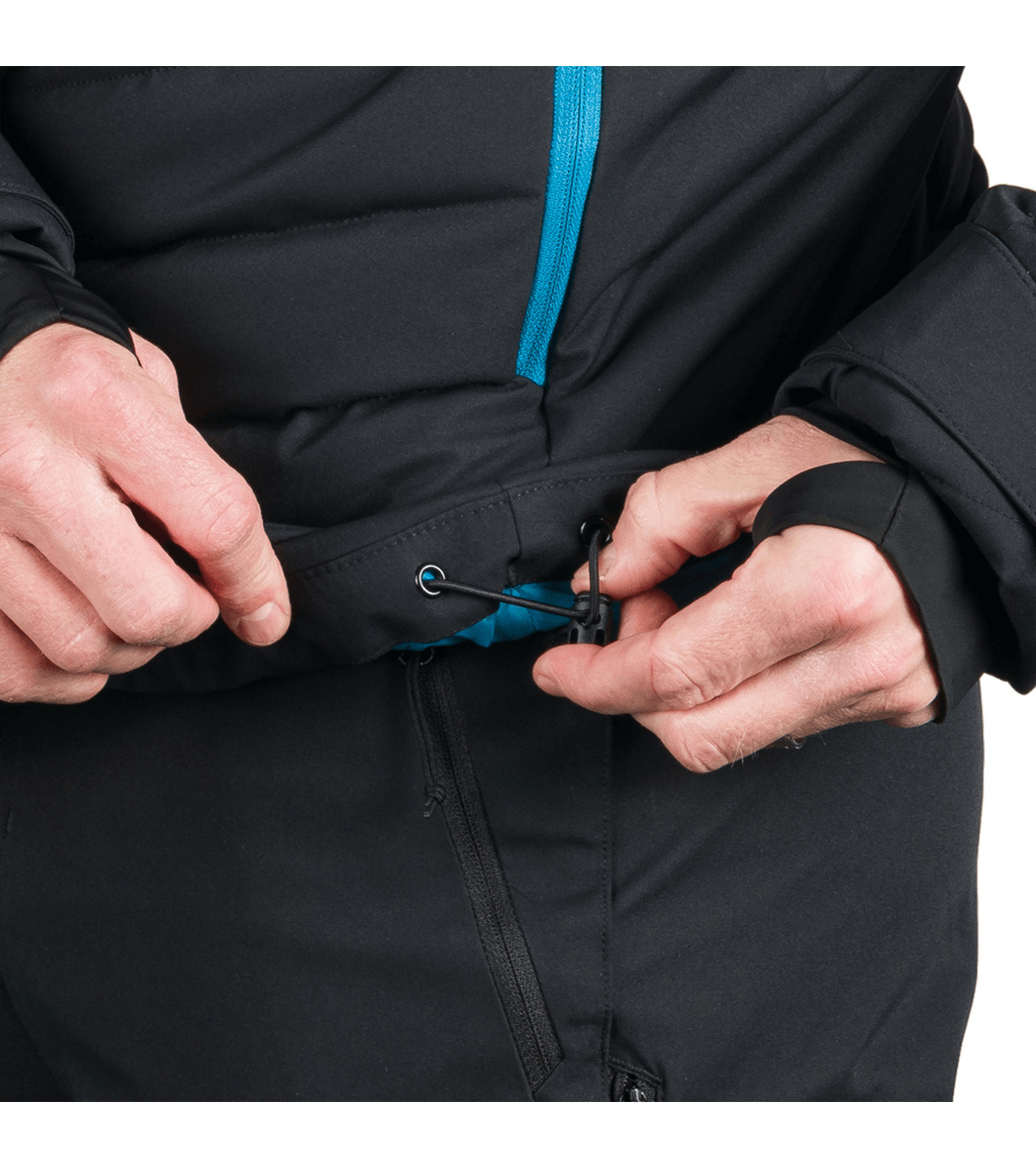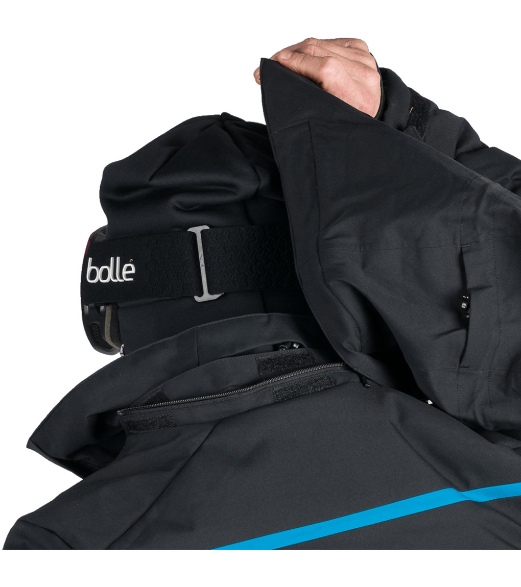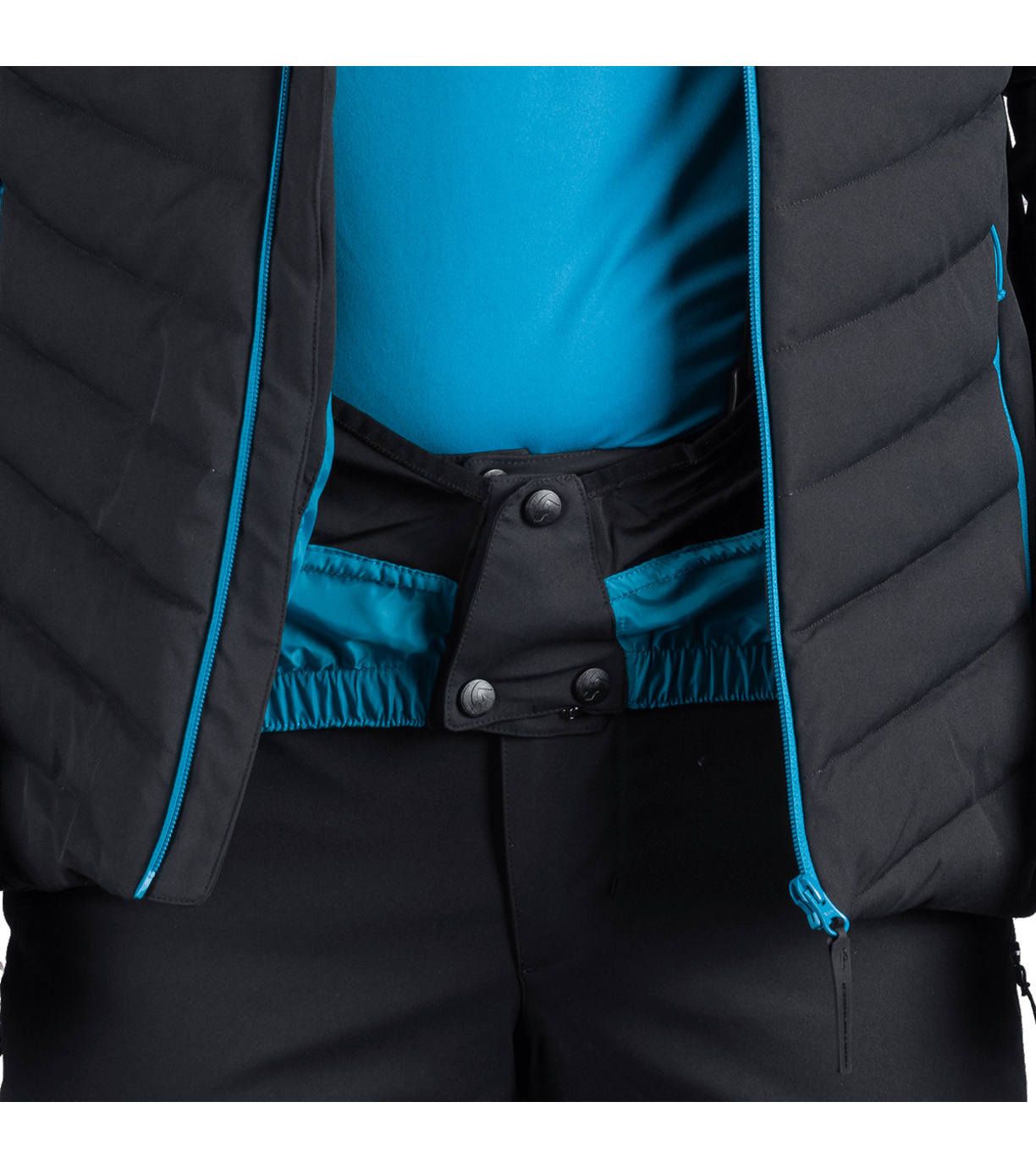 Na trwało wszyty pas ochronny przeciwśnieżny, który zapobiega przedostawaniu się śniegu pod ubranie. Na dole wszyta jest elastyczna guma antypoślizgowa.