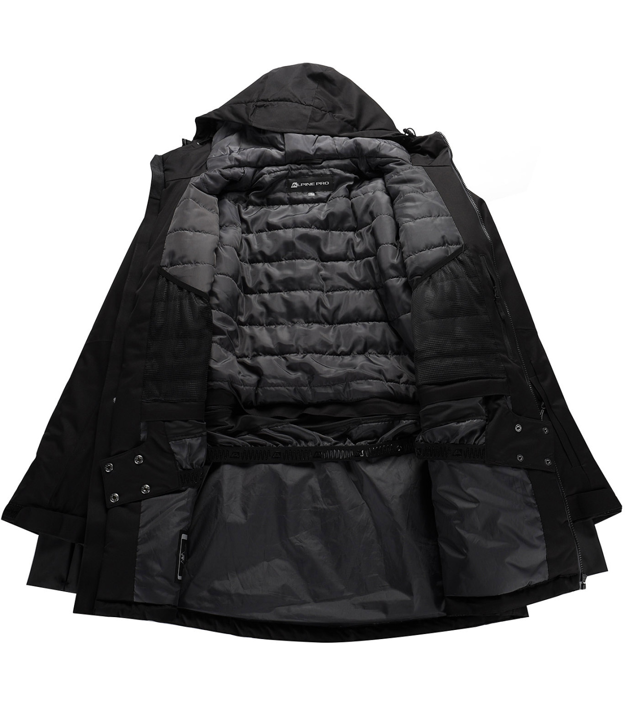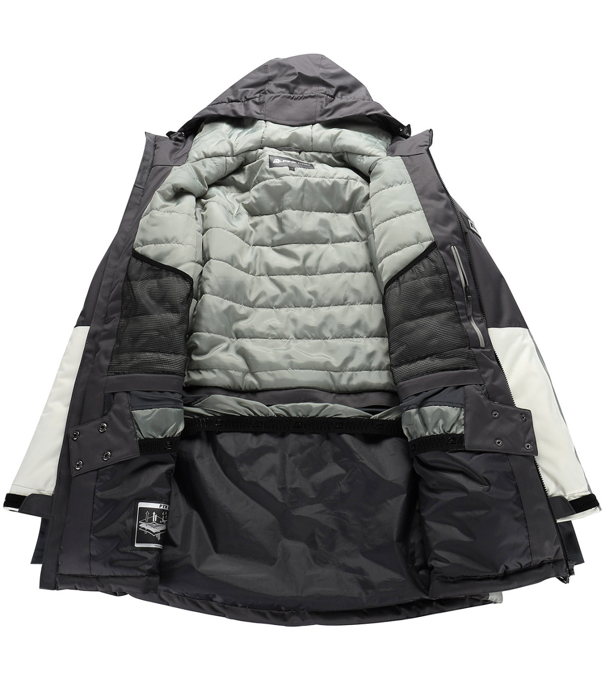 Funkcjonalna konstrukcja obejmuje wentylację zapinaną na suwak pod pachami, pikowaną podszewkę i odpinany pas śnieżny, który chroni przed śniegiem. Rękawy wyposażone są w elastyczne mankiety z otworami na kciuki i regulacją na rzep, co zapewnia dodatkową ochronę i wygodę. Dolna część kurtki jest przedłużona z tyłu i wyposażona w gumkę umożliwiającą regulację szerokości, co pozwala na dopasowanie kurtki do własnych potrzeb.