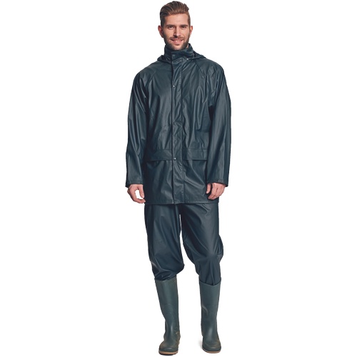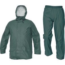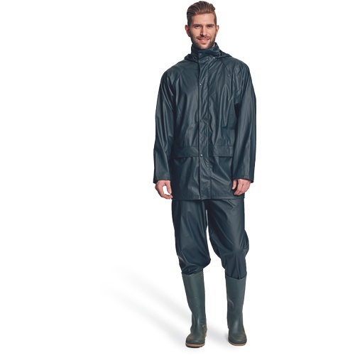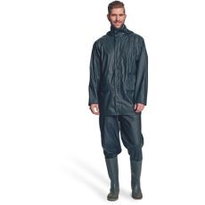 Opis: • wodoodporny i wiatroszczelny komplet • płaszcz przeciwdeszczowy ¾ z kapturem chowanym w kołnierzu i spodnie z elastyczną gumą w pasie • nieszeleszczący materiał • 2 szerokie kryte kieszenie • mankiety z możliwością regulacji za pomocą zatrzasków