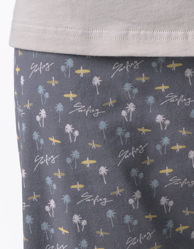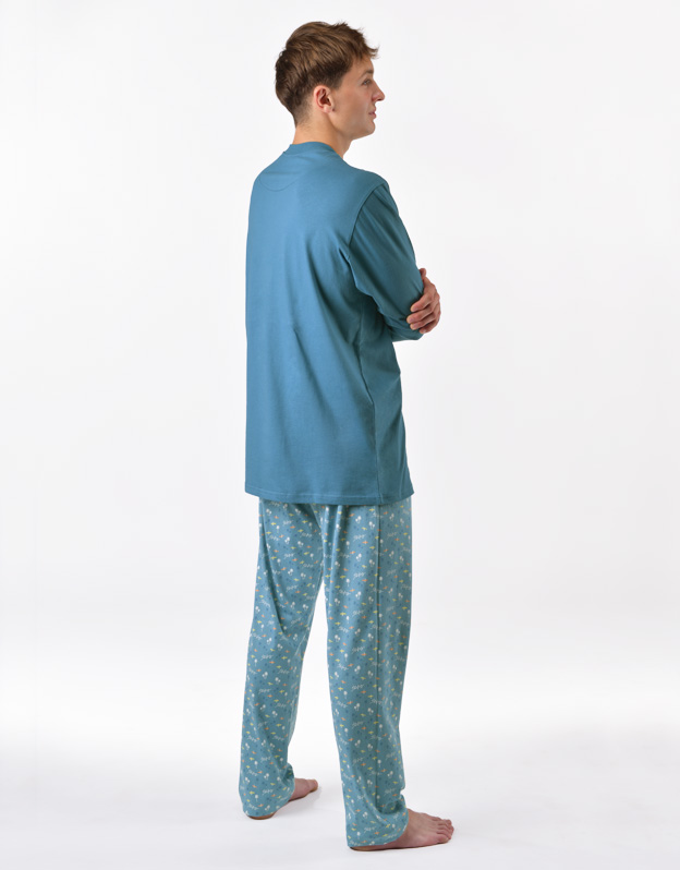 Klasyczna, luźna piżama męska wykonana z wysokiej jakości dzianiny zapewni Ci komfort podczas snu. Spodnie w drobniejszy wzór uzupełnione są koszulką z długim rękawem i większym nadrukiem na klatce piersiowej.