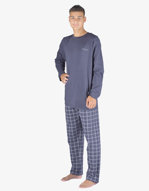 Klasyczna, luźna piżama męska wykonana z cienkiej dzianiny zapewni Ci komfort podczas snu. Uzupełnieniem spodni w popularną kratę jest T-shirt z długim rękawem i nadrukiem na piersi.