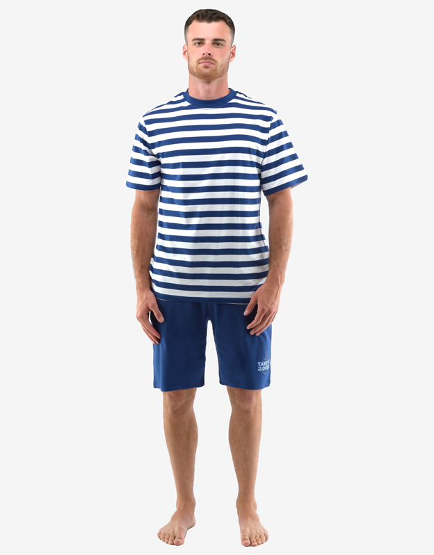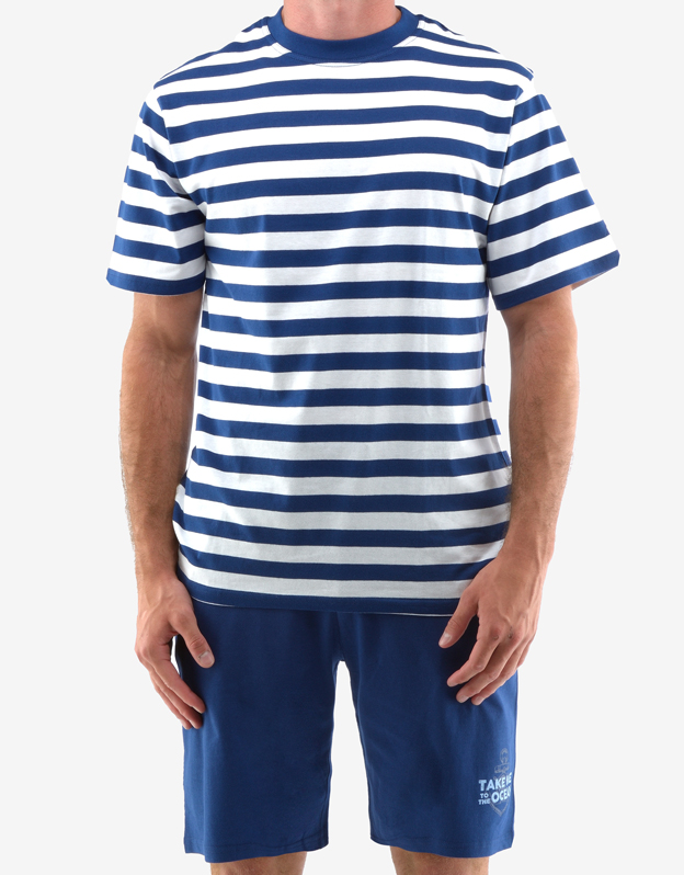 Podstawą wysokiej jakości snu jest Twój komfort, w czym pomaga również wygodna bielizna nocna. T-shirt z okrągłym dekoltem ma tkany wzór w paski, a krótkie spodnie w jednolitym kolorze są wykończone pojedynczym nadrukiem na lewej nogawce. Dzianina bawełniana to idealny wybór materiału na bieliznę nocną i ucieszy fanów naturalnych materiałów.