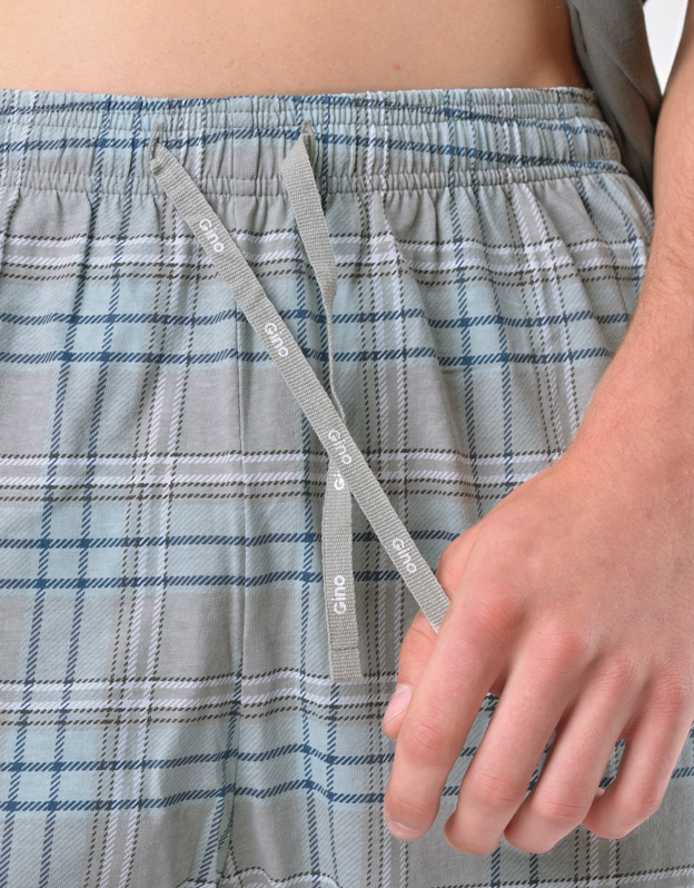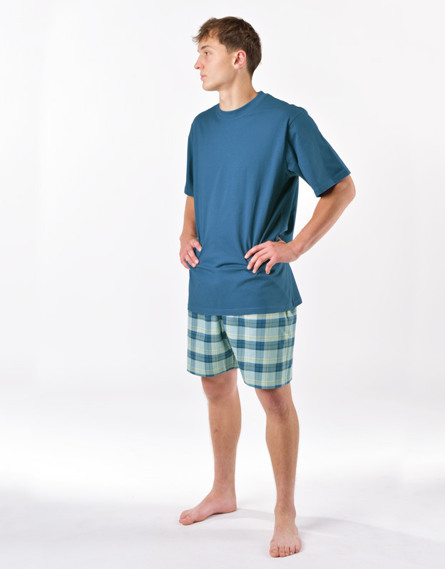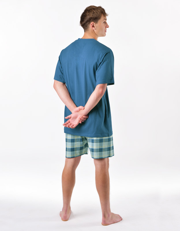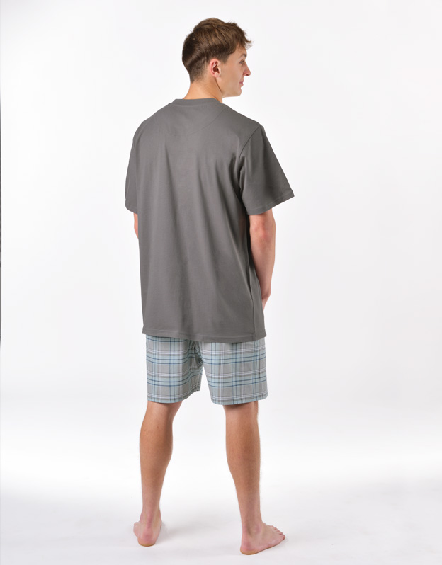 Luźna piżama męska wykonana z wysokiej jakości dzianiny zapewni Ci komfort podczas snu. Krótkie spodnie z popularnym wzorem w kratkę uzupełnią prosty T-shirt z krótkim rękawem.